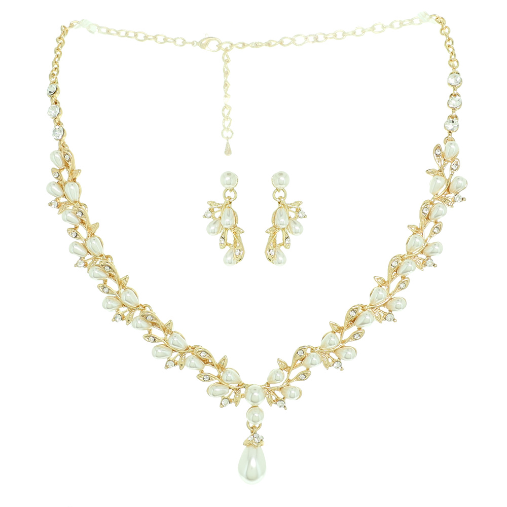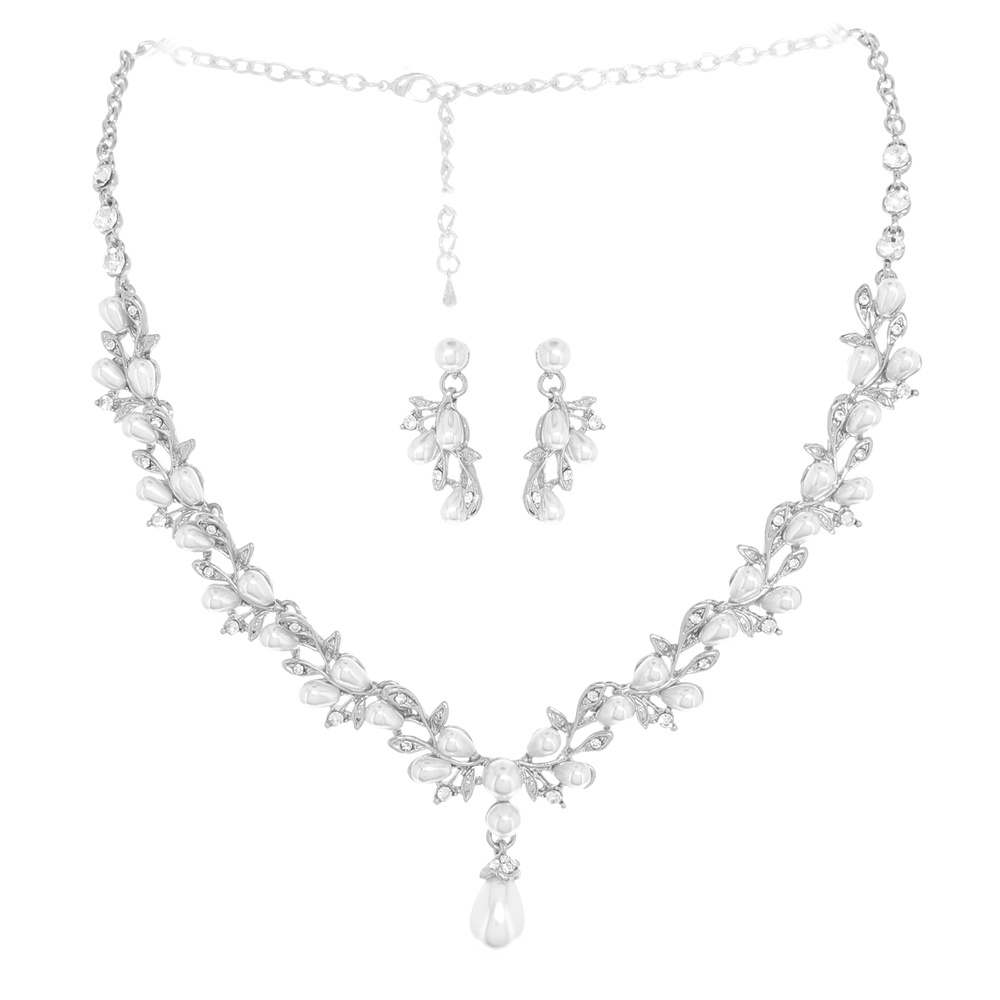 LEAF VINE PEARL RHINESTONE CLUSTER ADJUSTABLE V-SHAPED NECKLACE POST EARRING SET