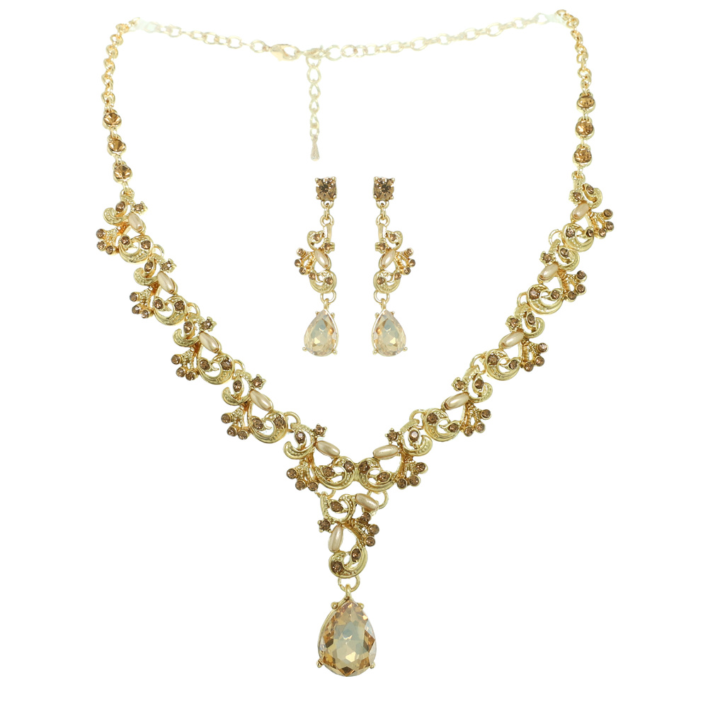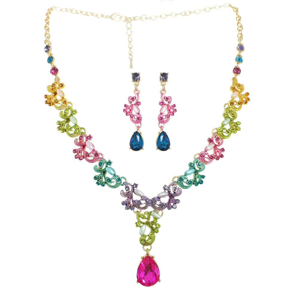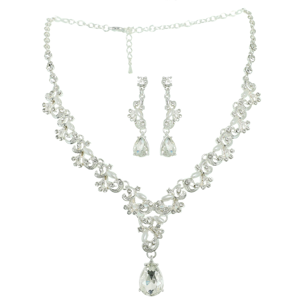 FLORAL GEMSTONE RHINESTONE PEARL TEARDROP V-SHAPE NECKLACE POST EARRING SET