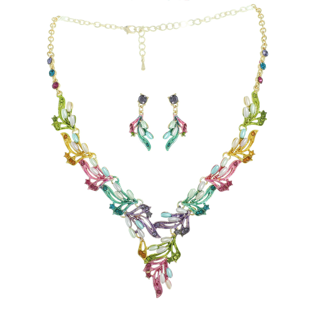 Filigree Leaf Petal Pearl Rhinestone Necklace Set