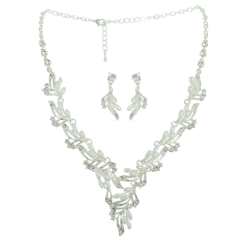 FILIGREE LEAF PETAL PEARL RHINESTONE CLUSTER ADJUSTABLE V-SHAPE NECKLACE POST EARRING SET