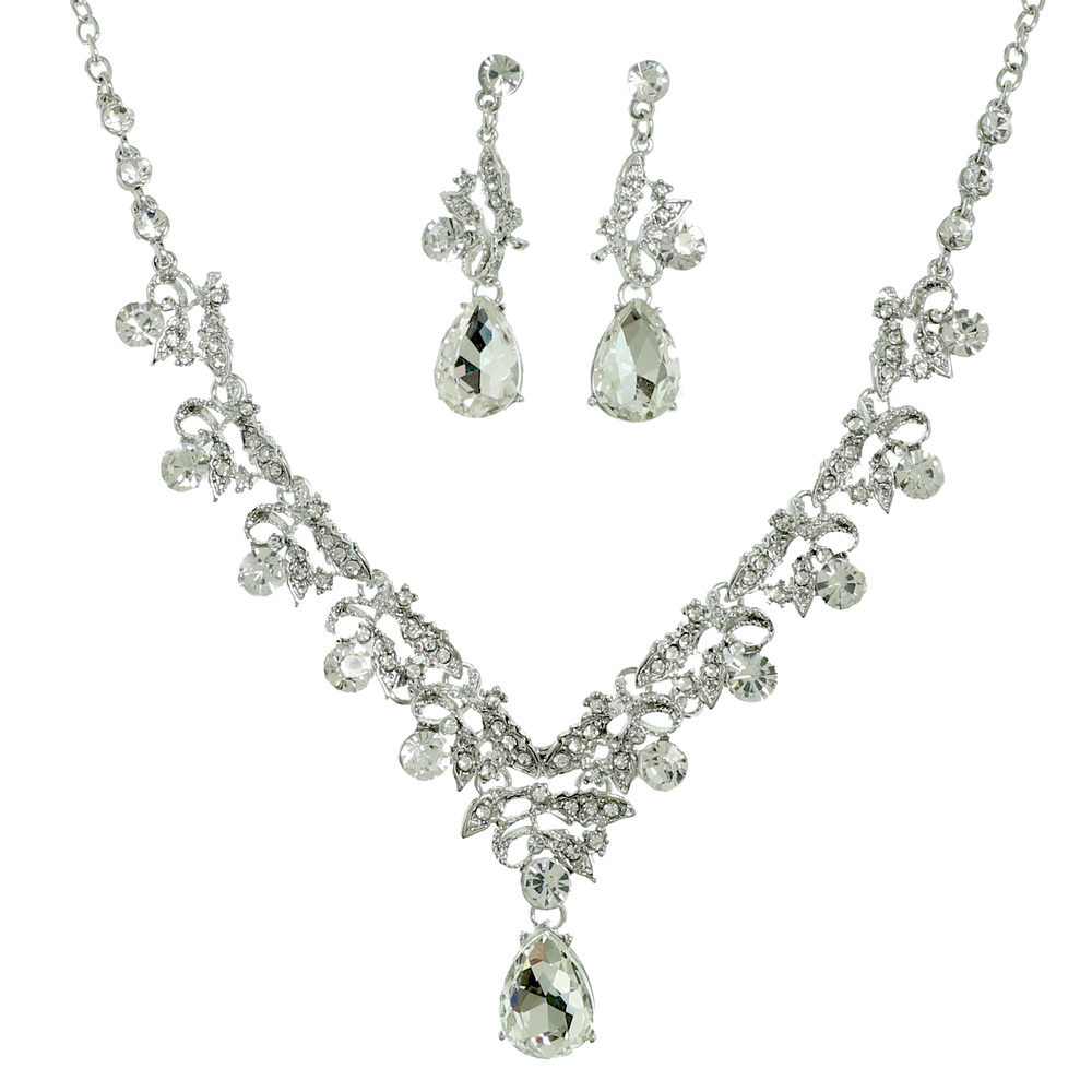 OLIVE BRANCH VINE PETAL CUT CRYSTAL GEMSTONE CLUSTER V-SHAPED ADJUSTABLE NECKLACE EARRING SET