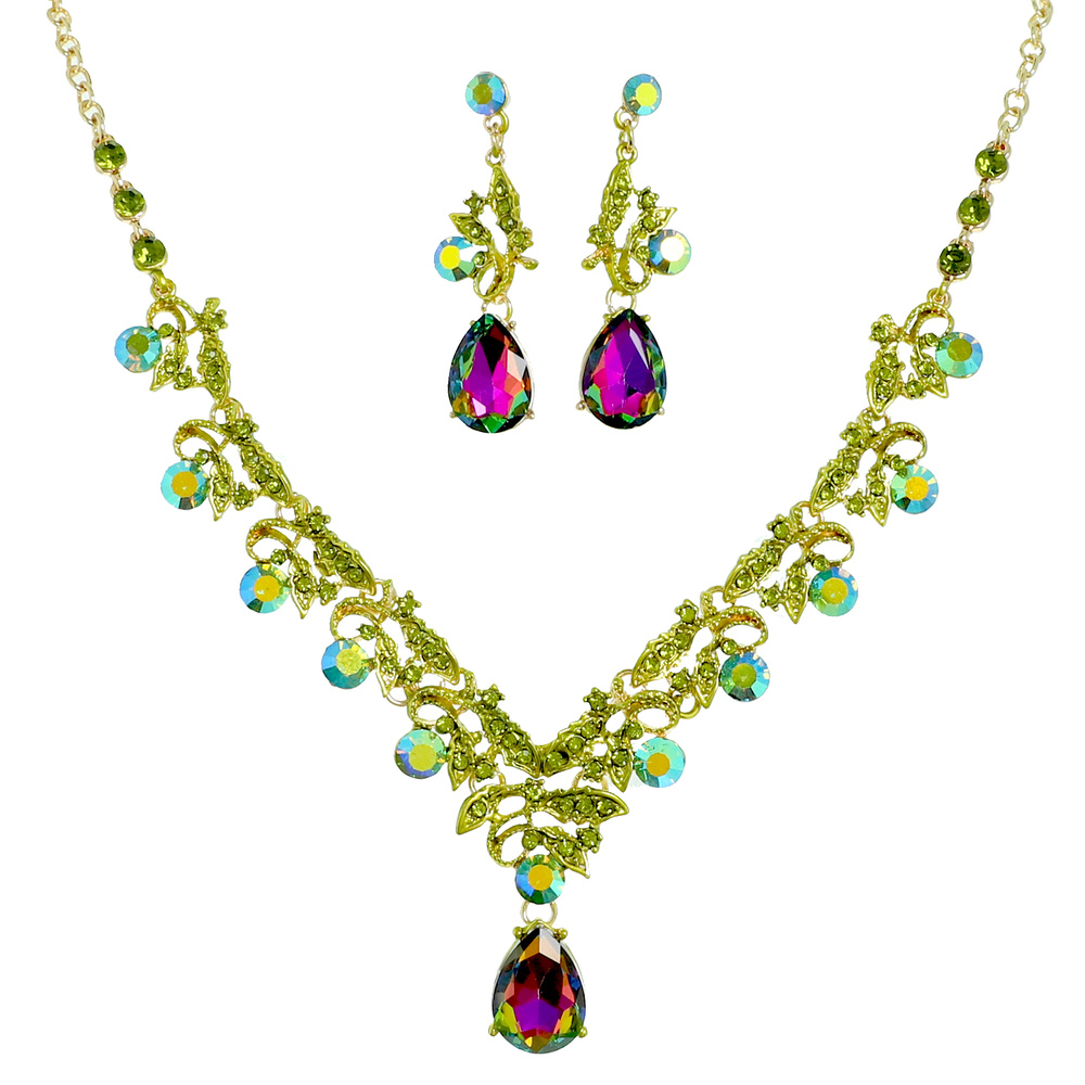 OLIVE BRANCH VINE PETAL CUT CRYSTAL GEMSTONE CLUSTER V-SHAPED ADJUSTABLE NECKLACE EARRING SET