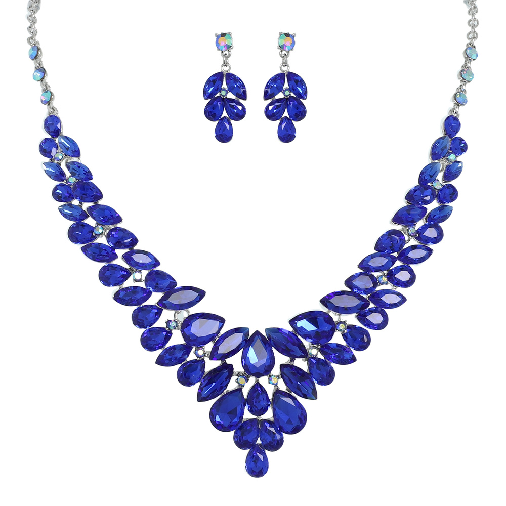 CRYSTAL GEMSTONE TEARDROP CLUSTER V-SHAPED ADJUSTABLE NECKLACE EARRING SET