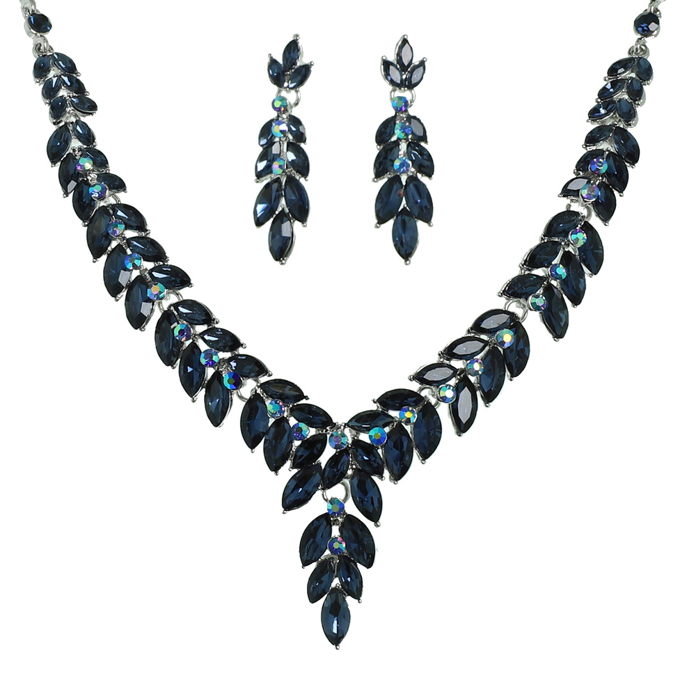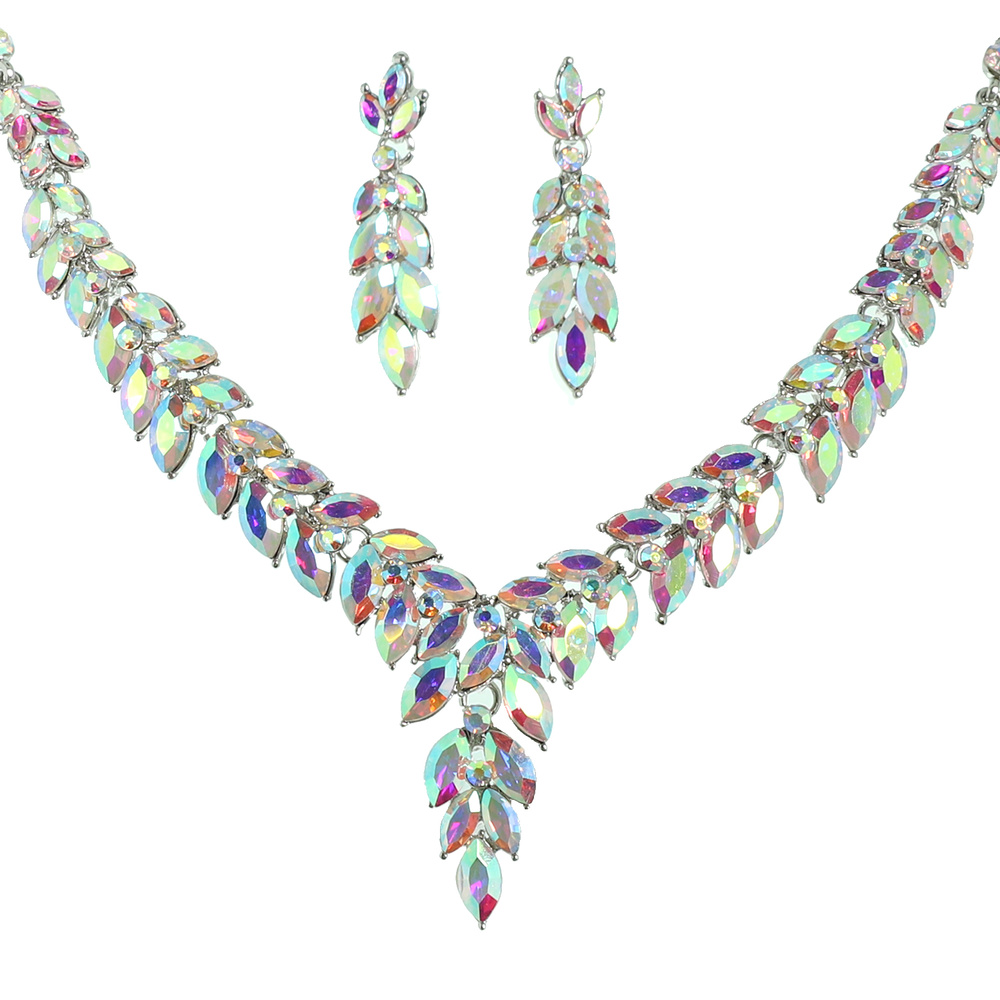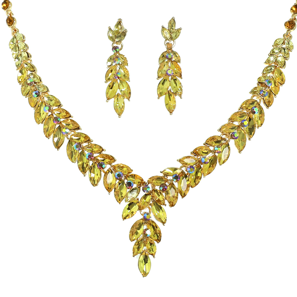 OLIVE BRANCH VINE PETAL CUT CRYSTAL GEMSTONE CLUSTER V-SHAPED ADJUSTABLE NECKLACE EARRING SET