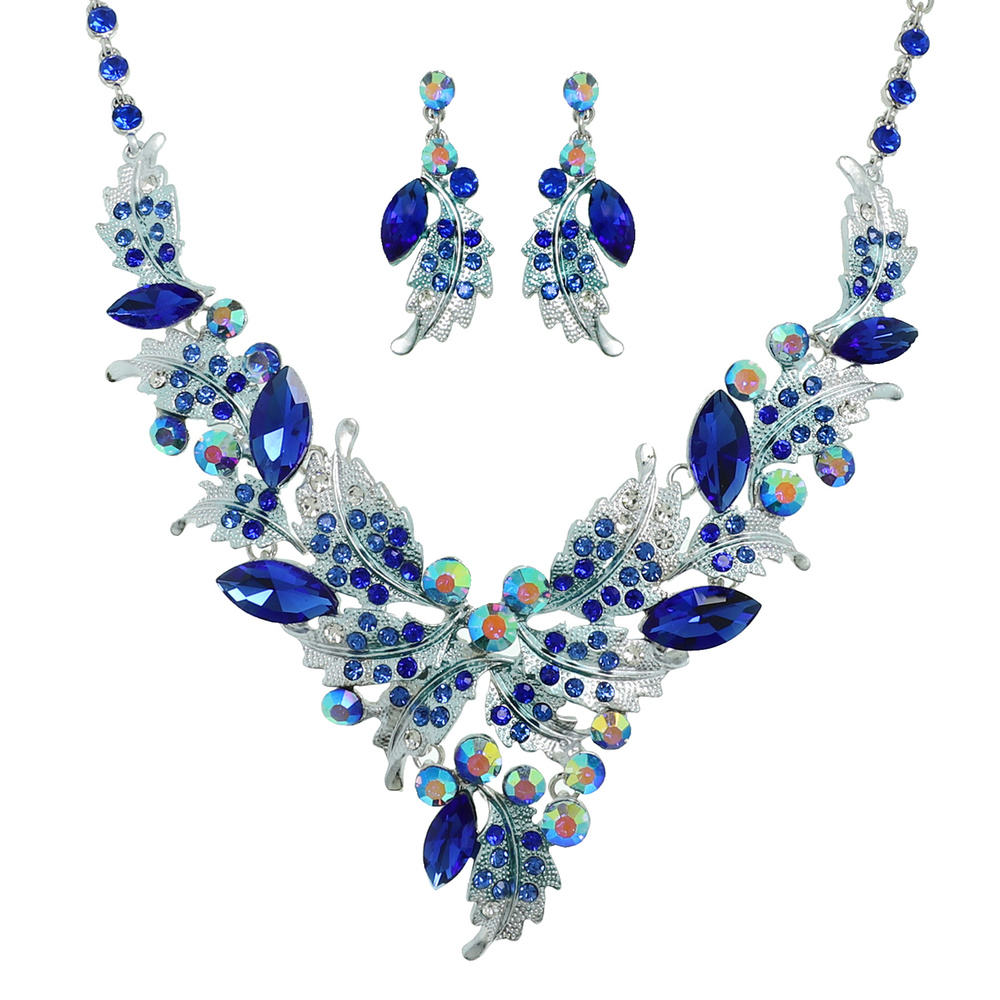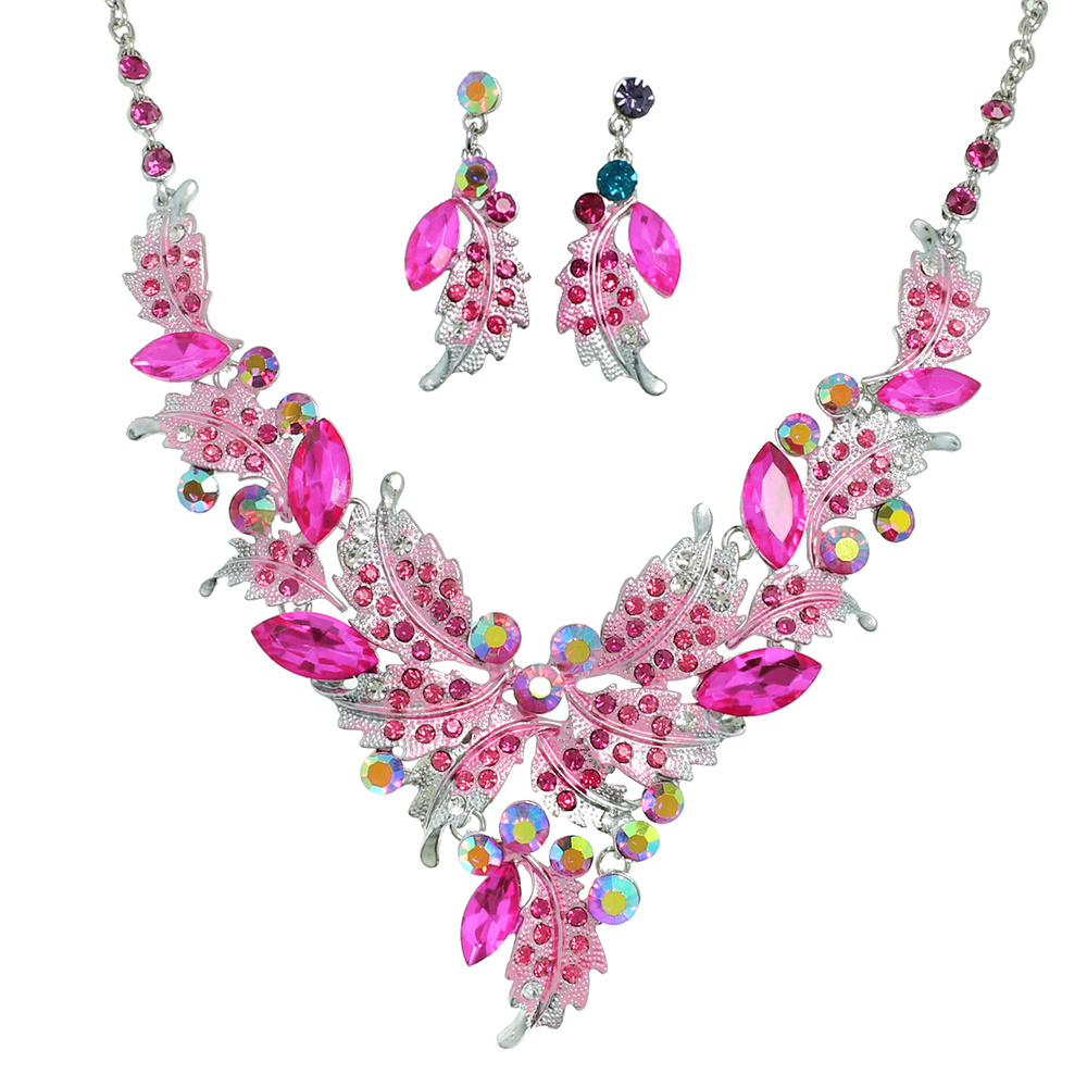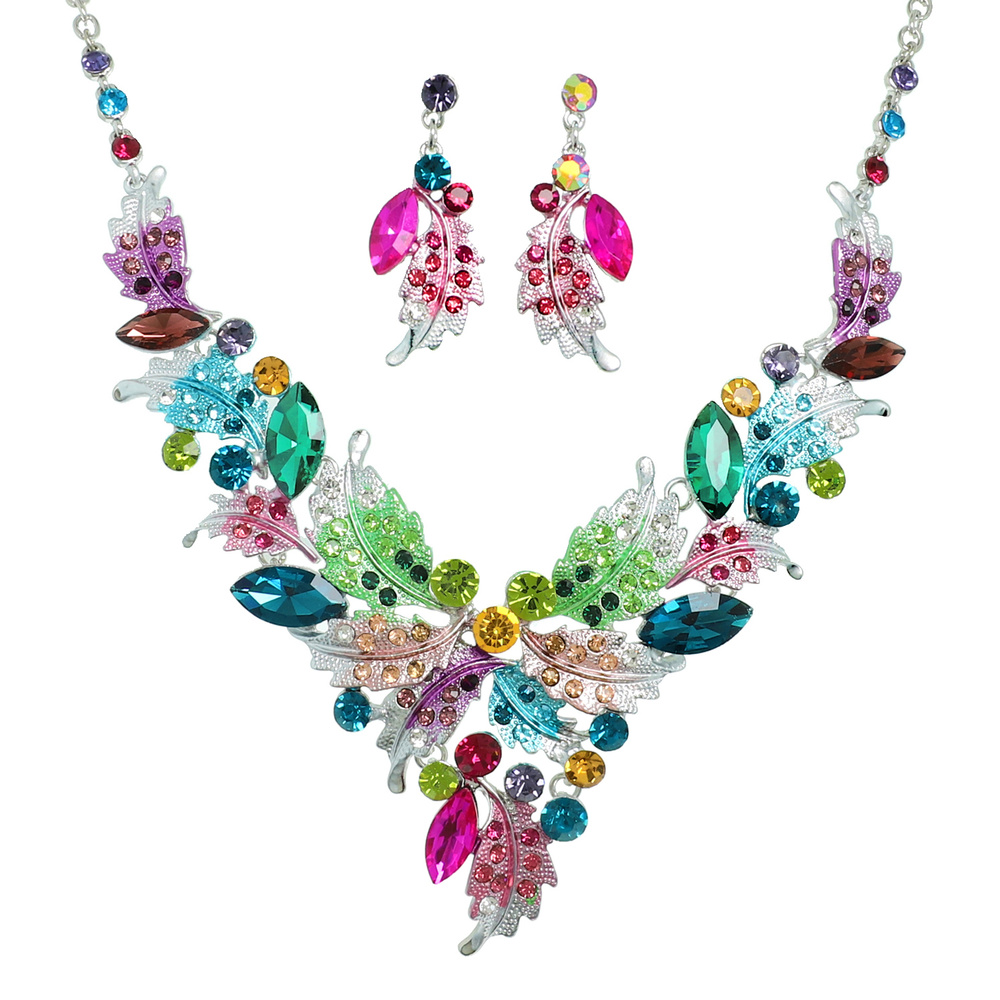 LEAF DESIGN PETAL CUT CRYSTAL GEMSTONE V-SHAPED ADJUSTABLE NECKLACE EARRING SET