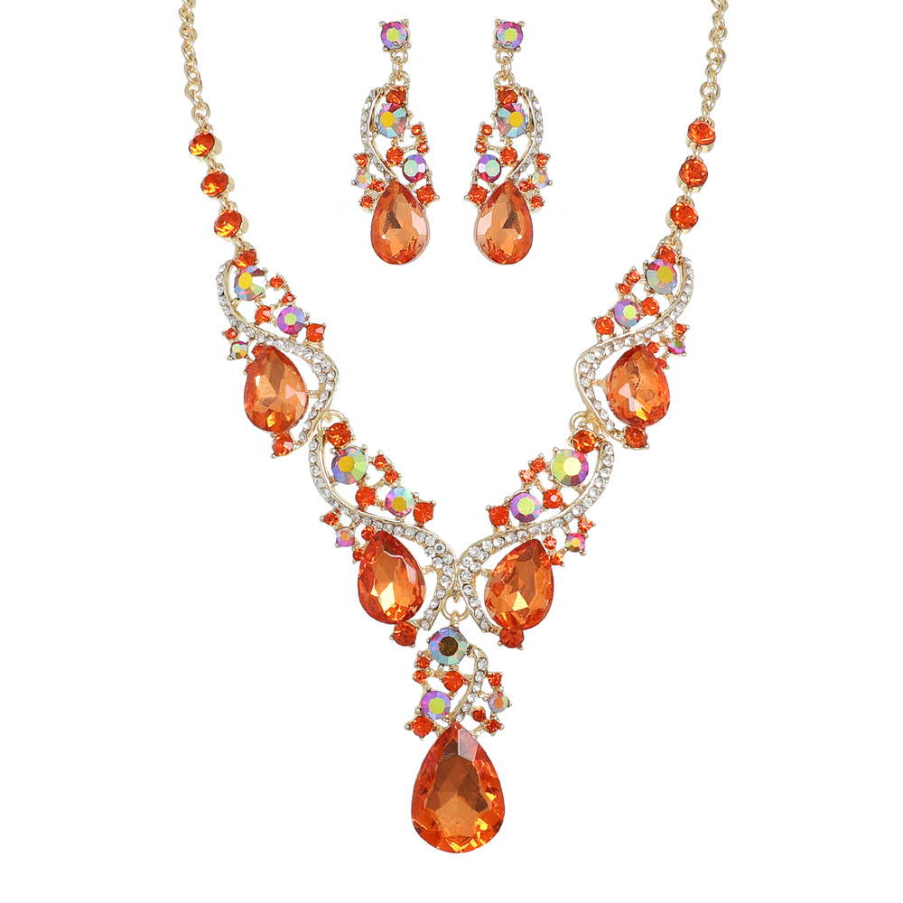 CRYSTAL GEMSTONE TEARDROP CLUSTER V-SHAPED ADJUSTABLE NECKLACE EARRING SET