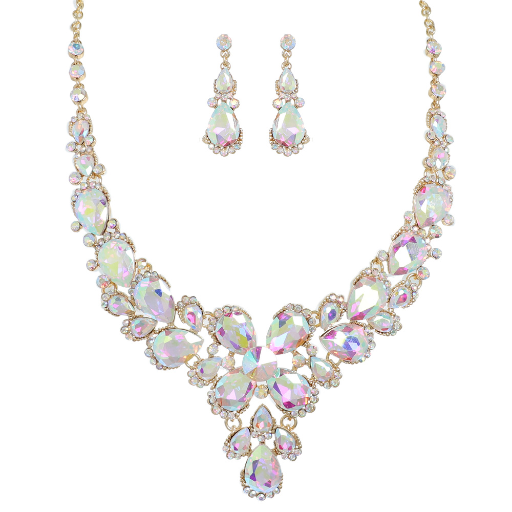 CRYSTAL GEMSTONE TEARDROP CLUSTER V-SHAPED ADJUSTABLE NECKLACE EARRING SET
