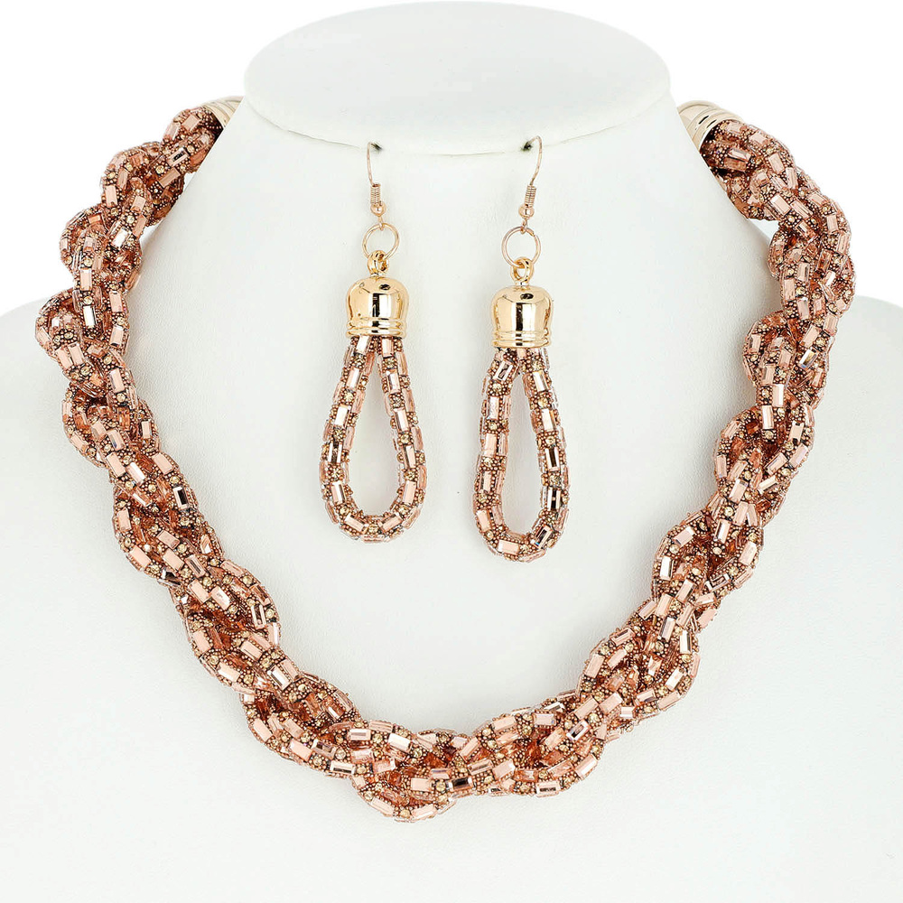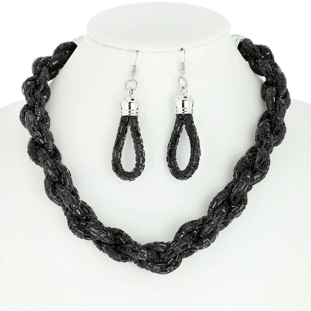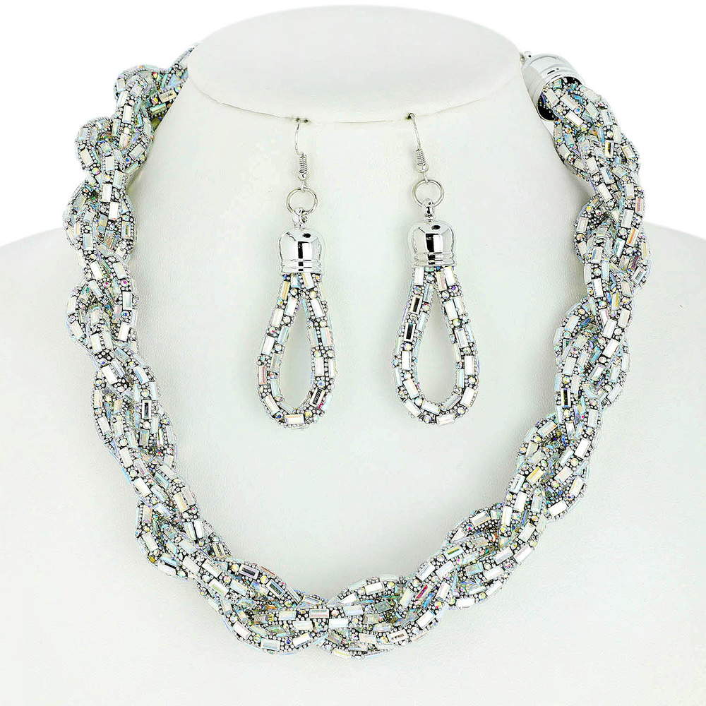 RECTANGLE RHINESTONE BRAIDED BIB NECKLACE AND EARRINGS SET