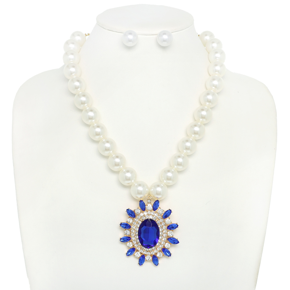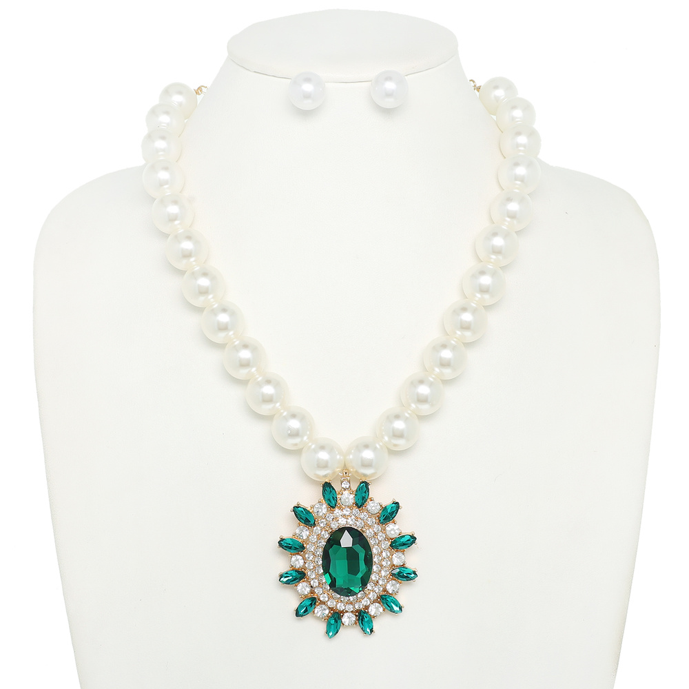 EMBELLISHED HALO TEARDROP GEMSTONE PENDANT PEARL NECKLACE EARRING SET