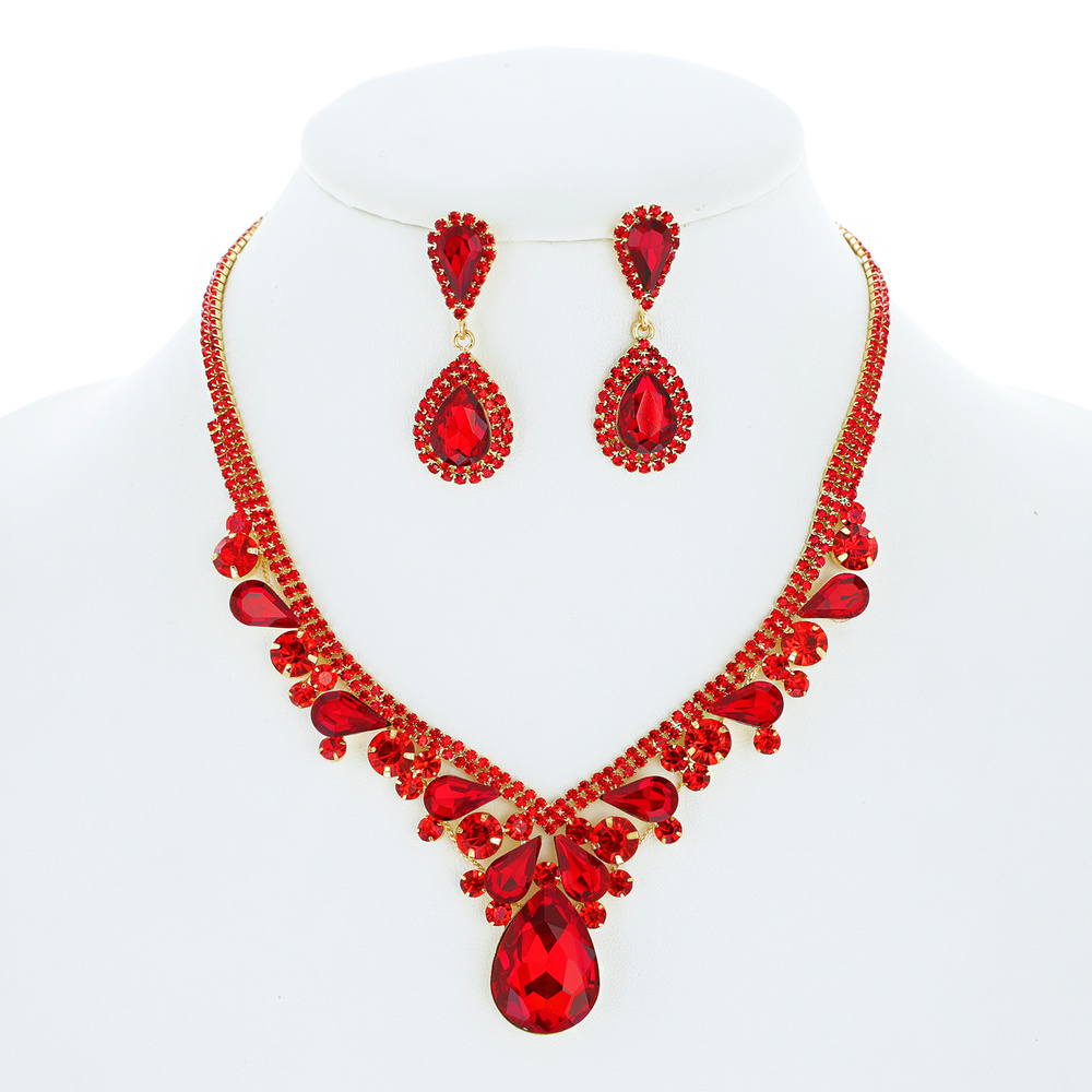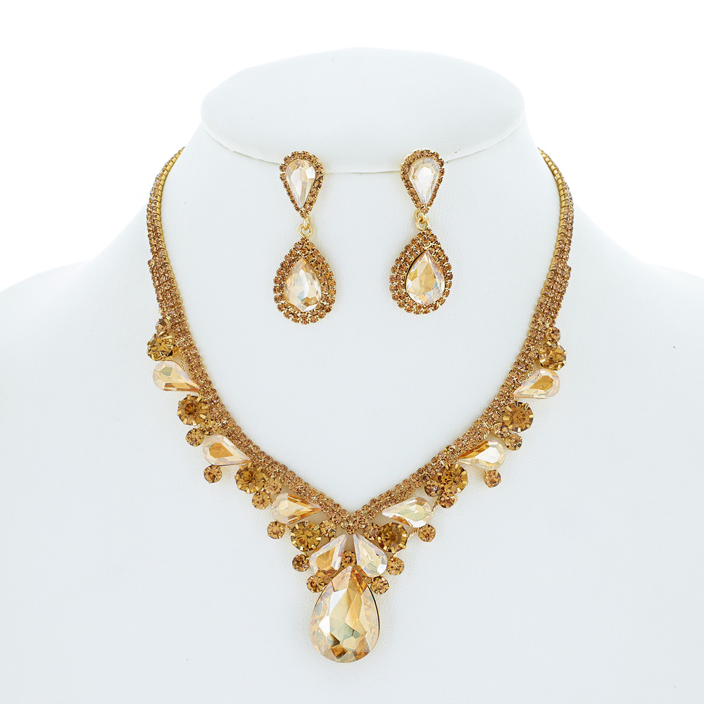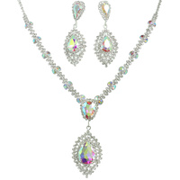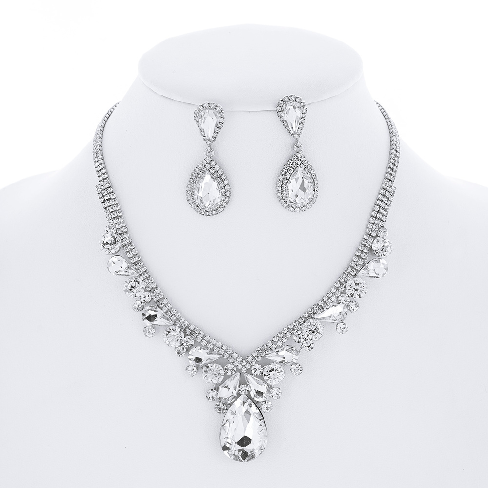 CRYSTAL TEARDROP CLUSTER ADJUSTABLE V-SHAPE BIB NECKLACE EARRING SET
