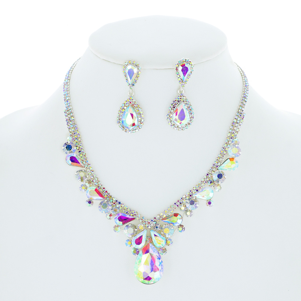 Crystal Teardrop Cluster Adjustable V-shape Bib Necklace Earring Set