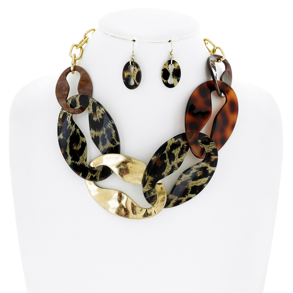 BOHO ANIMAL PRINT ACETATE OVAL LINK ADJUSTABLE CHAIN NECKLACE EARRING SET