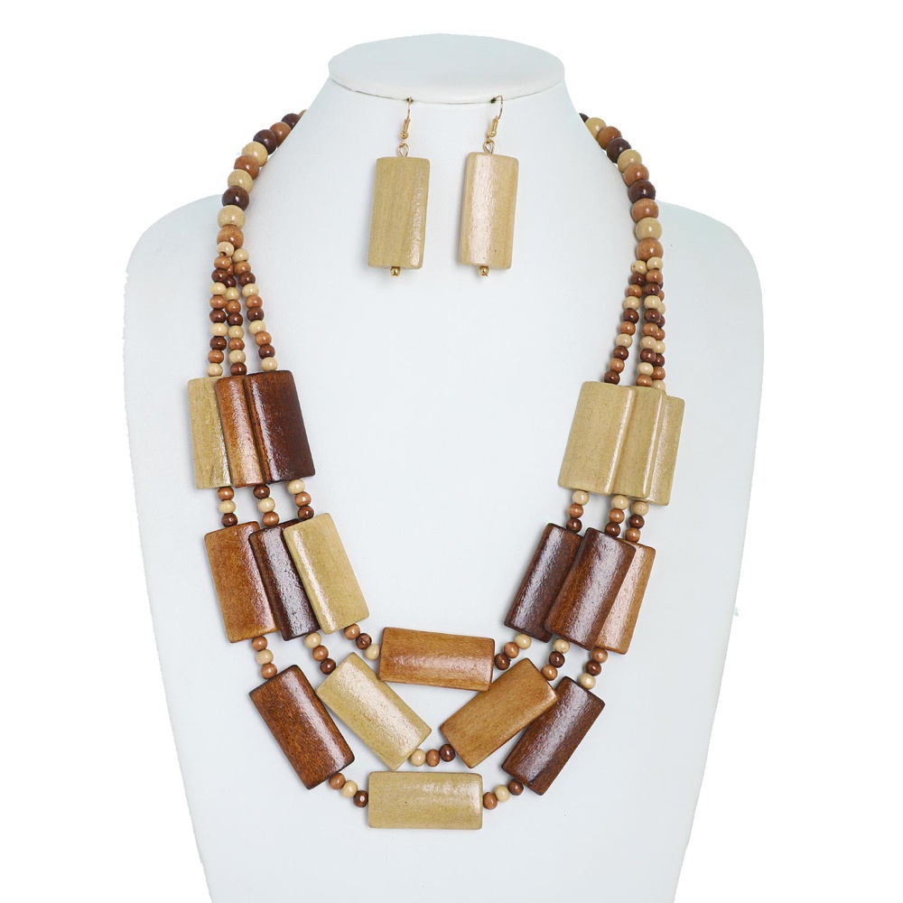 AFRICAN MULTICOLOR RECTANGULAR WOOD BEAD LAYERED ADJUSTABLE BIB NECKLACE EARRING SET