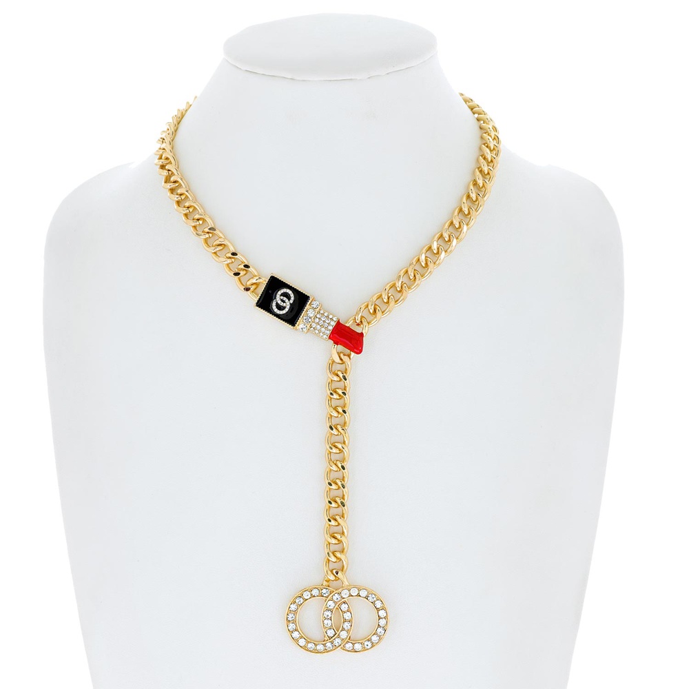 Crystal Rhinestone Pave Fashionista Enamel Coated Lipstick Cuban Chain Link Lariat Necklace
