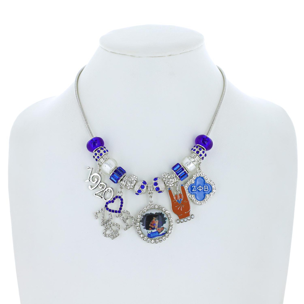 HOWARD UNIVERSITY 1920 ZETA PHI BETA GREEK SORORITY ENAMEL COATED CRYSTAL RHINESTONE ADJUSTABLE MULTI CHARM NECKLACE IN SILVER TONE METAL