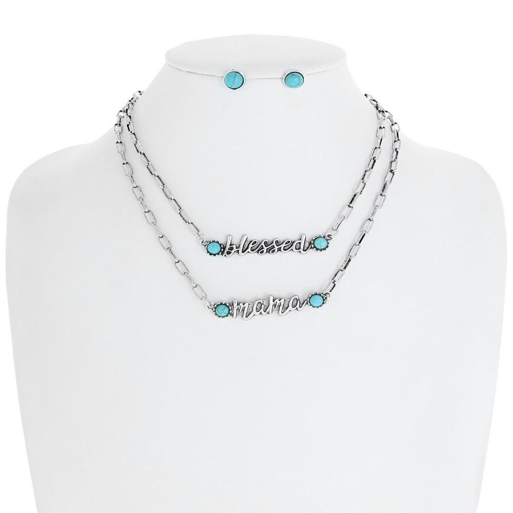 Western Turquoise Semi Stone "blessed Mama" Multi Strand Adjustable Pendant Necklace Earring Set