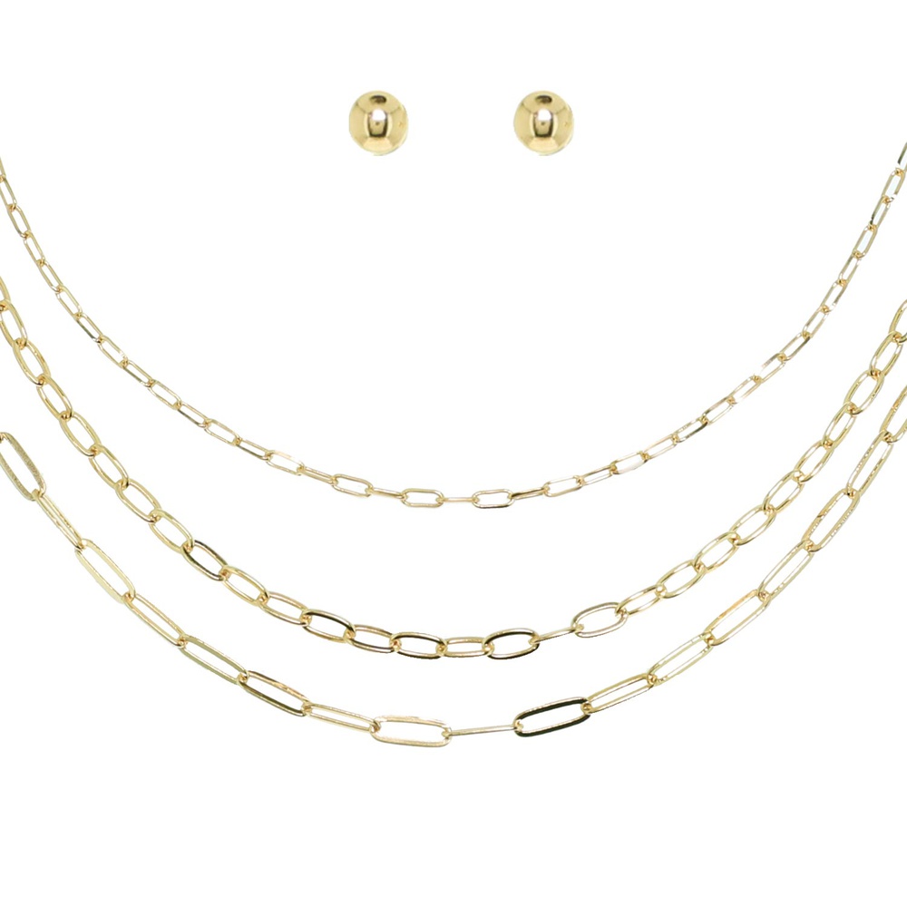 16" MULTI STRAND ADJUSTABLE CHAIN NECKLACE AND STUD EARRING SET IN GOLD TONE METAL