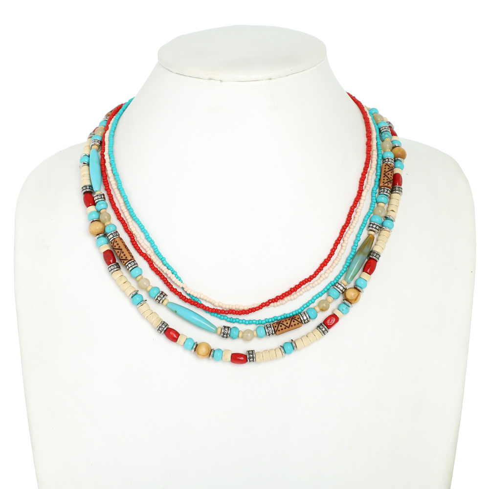 18"WESTERN TURQUOISE SEMI STONE WOOD BEAD MIX ADJUSTABLE MULTI STRAND LAYERED LOOK NECKLACE IN OXIDIZED SILVER TONE METAL