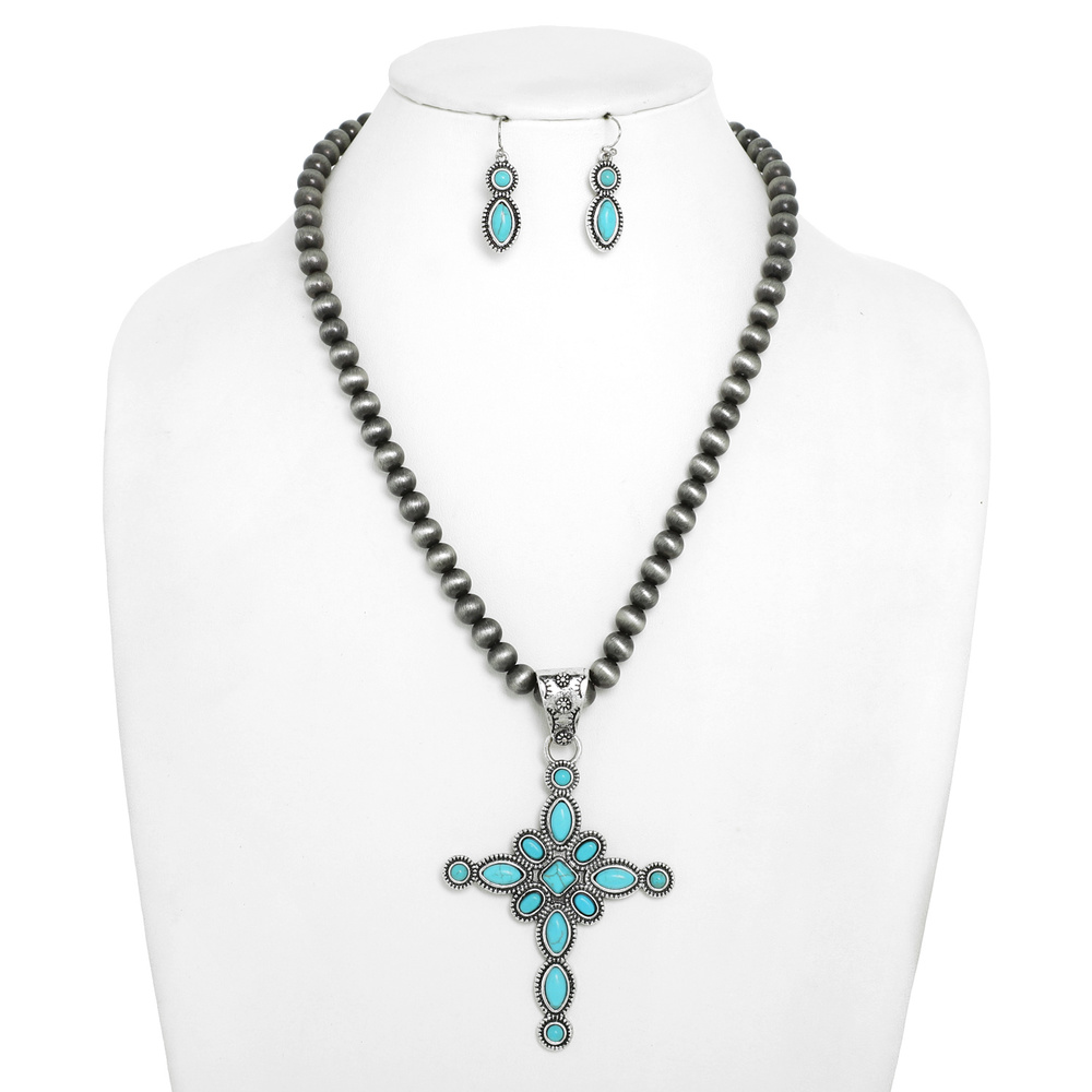 18" WESTERN NAVAJO PEARL BEADED ADJUSTABLE CROSS PENDANT NECKLACE EARRING SET IN OXIDIZED SILVER TONE METAL