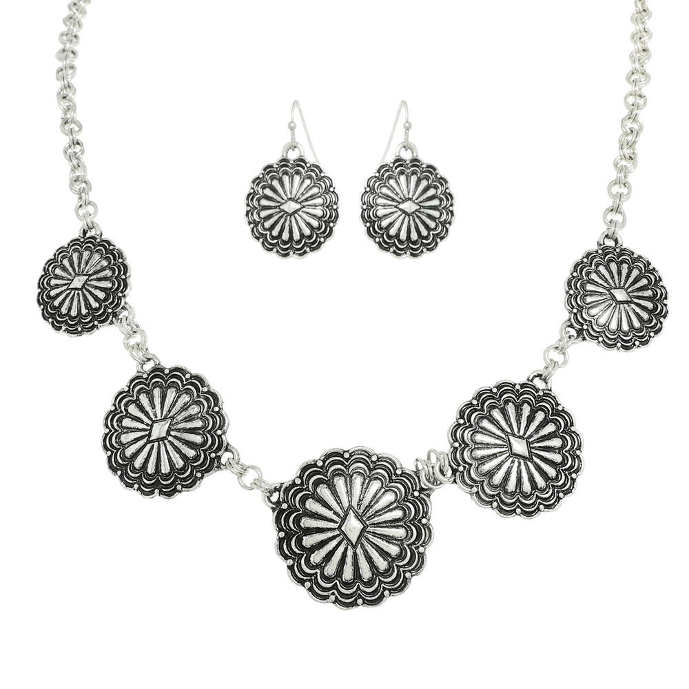 WESTERN CONCHO CHAIN LINK ADJUSTABLE NECKLACE EARRING SET IN OXIDIZED SILVER TONE METAL