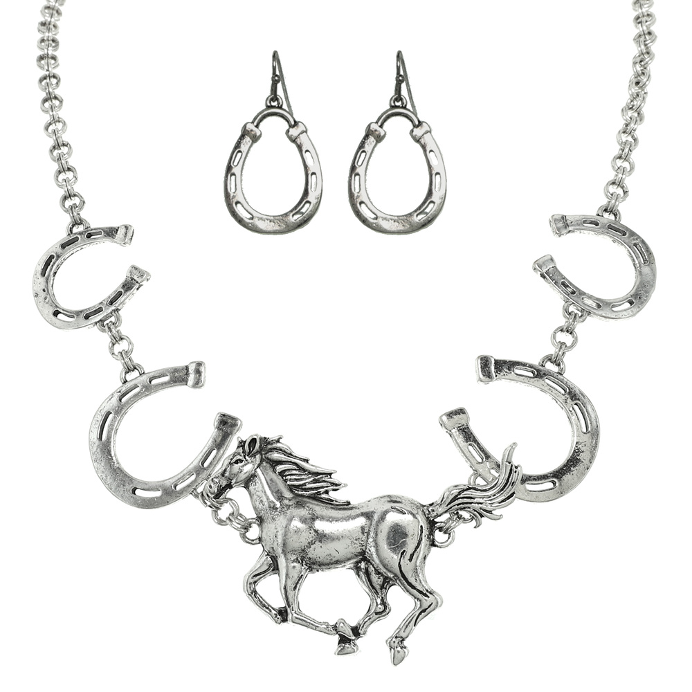 WESTERN EQUESTRIAN RUNNING HORSE HORSESHOE CHAIN LINK ADJUSTABLE NECKLACE EARRING SET IN OXIDIZED SILVER TONE METAL