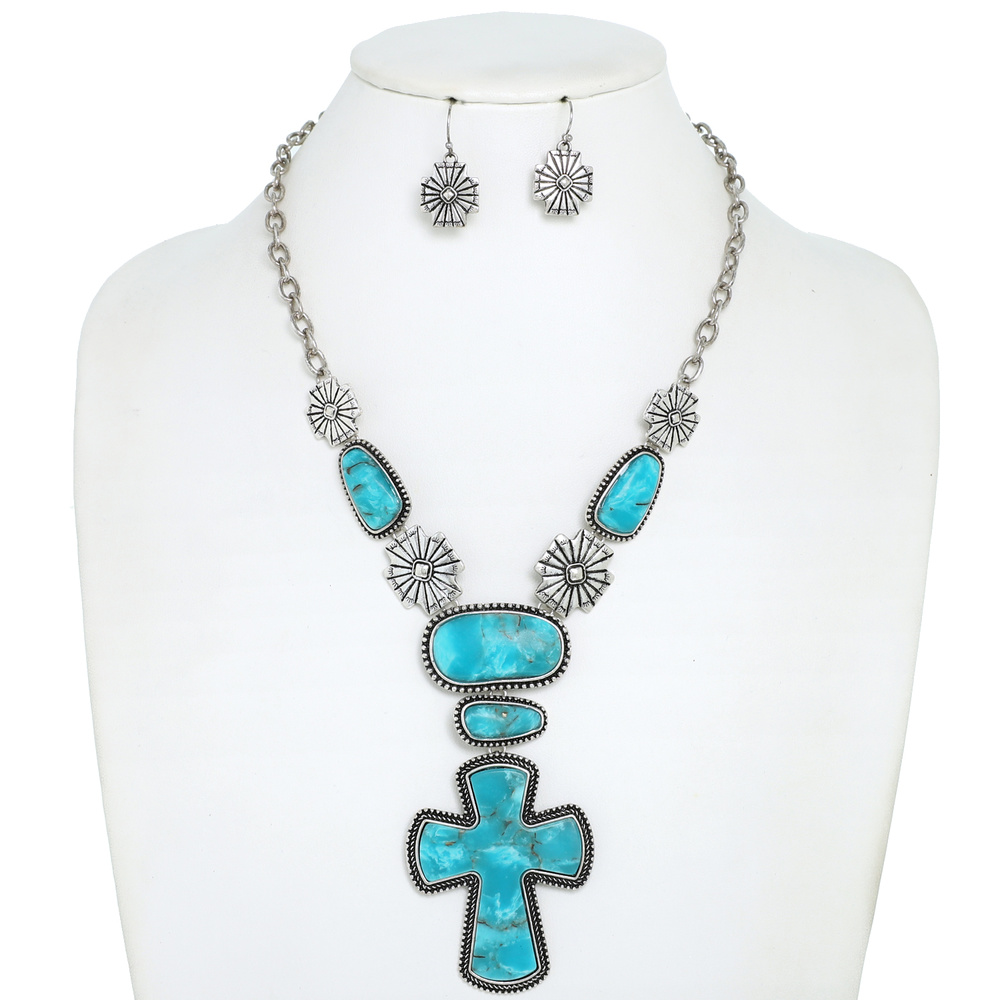 18" WESTERN CHAIN LINK ADJUSTABLE CROSS PENDANT LARIAT NECKLACE EARRING SET IN OXIDIZED SILVER TONE METAL