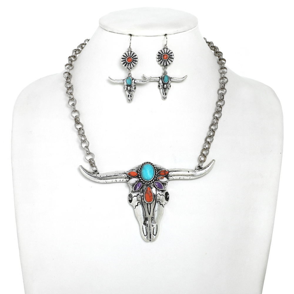 WESTERN TURQUOISE SEMI STONE ADJUSTABLE LONGHORN STEER PENDANT CHAIN NECKLACE EARRING SET IN OXIDIZED SILVER TONE METAL