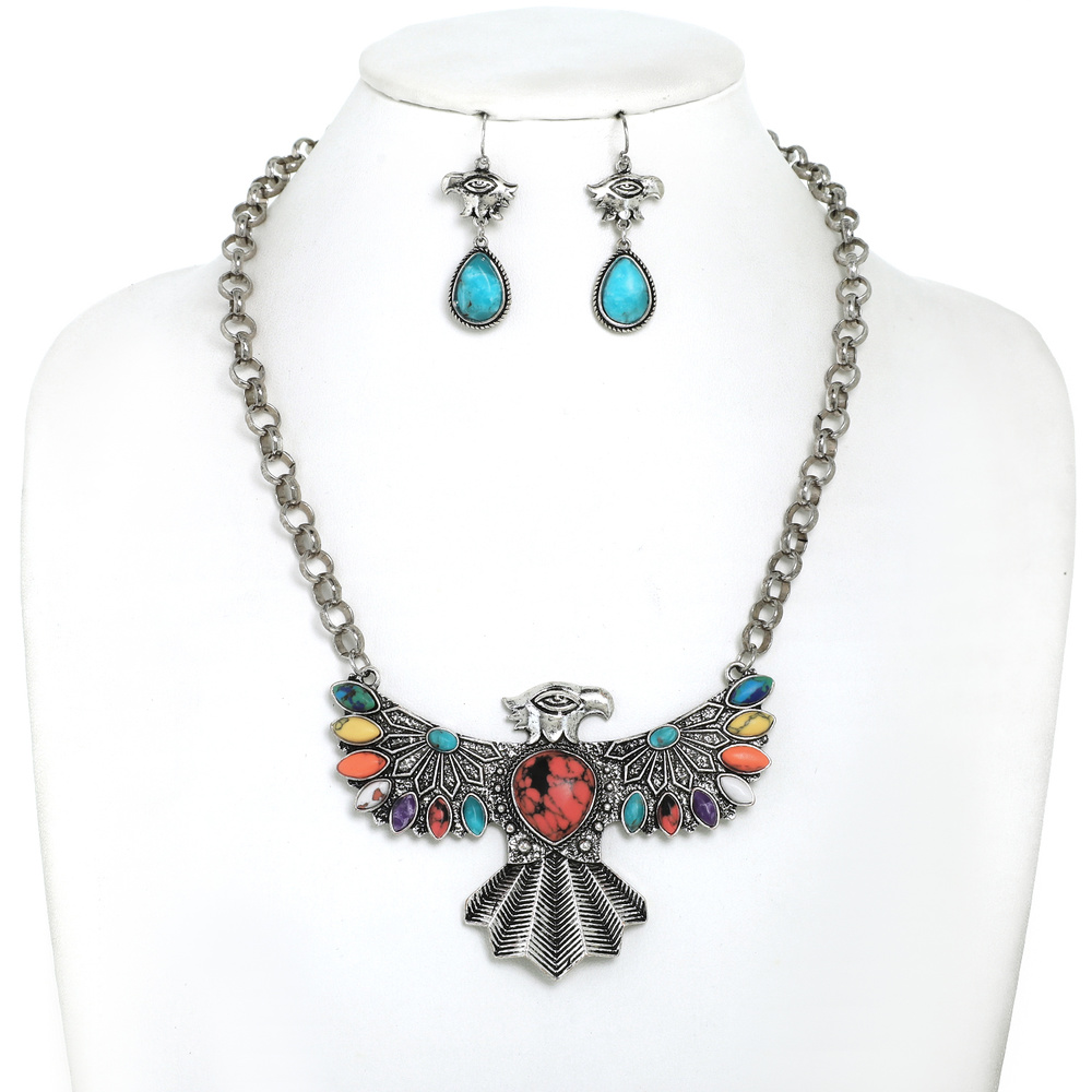 WESTERN TURQUOISE SEMI STONE ADJUSTABLE THUNDERBIRD PENDANT CHAIN NECKLACE EARRING SET IN OXIDIZED SILVER TONE METAL
