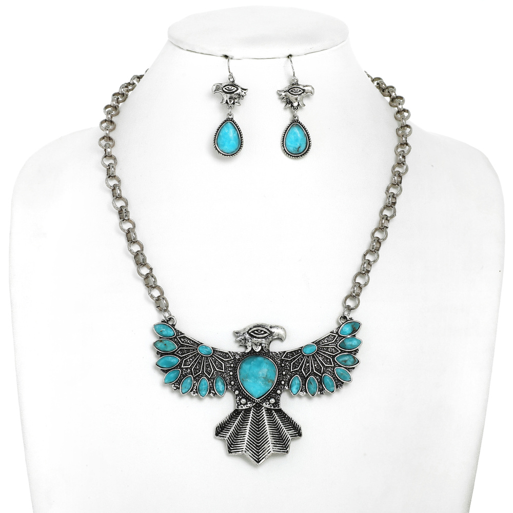 WESTERN TURQUOISE SEMI STONE ADJUSTABLE THUNDERBIRD PENDANT CHAIN NECKLACE EARRING SET IN OXIDIZED SILVER TONE METAL