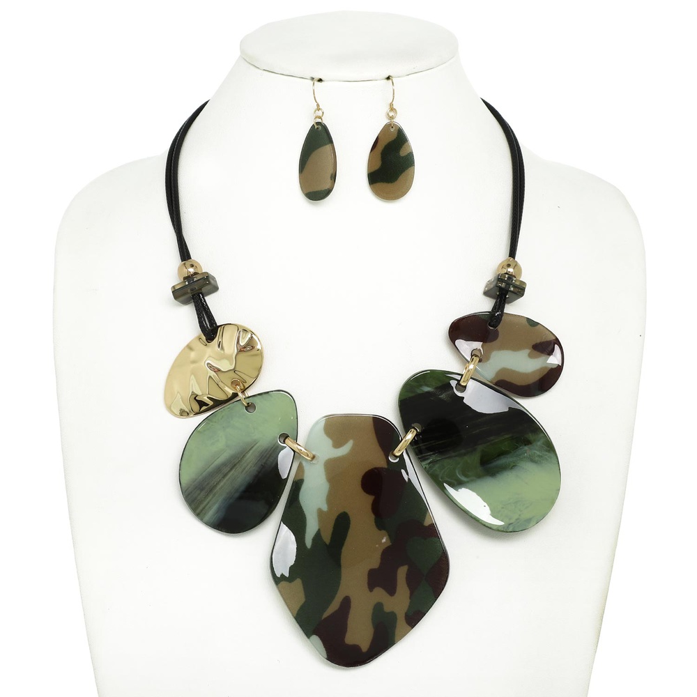 19" IRREGULAR OVAL ADJUSTABLE ACETATE CORD BIB NECKLACE EARRING SET IN GOLD TONE METAL