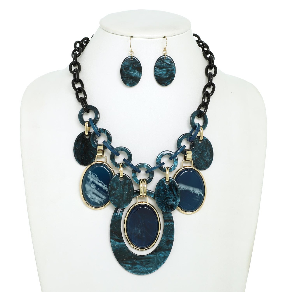 17" OVAL ADJUSTABLE ACETATE CHAIN LINK BIB NECKLACE EARRING SET IN GOLD TONE METAL