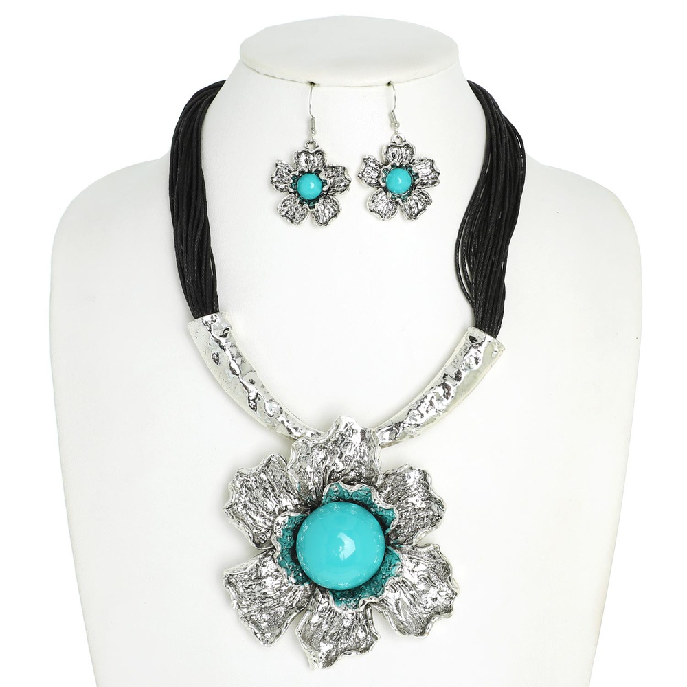 17" BOHEMIAN HAMMERED METAL FLORAL TURQUOISE SEMI STONE ADJUSTABLE CORD BIB NECKLACE EARRING SET IN GOLD AND SILVER TONE METAL