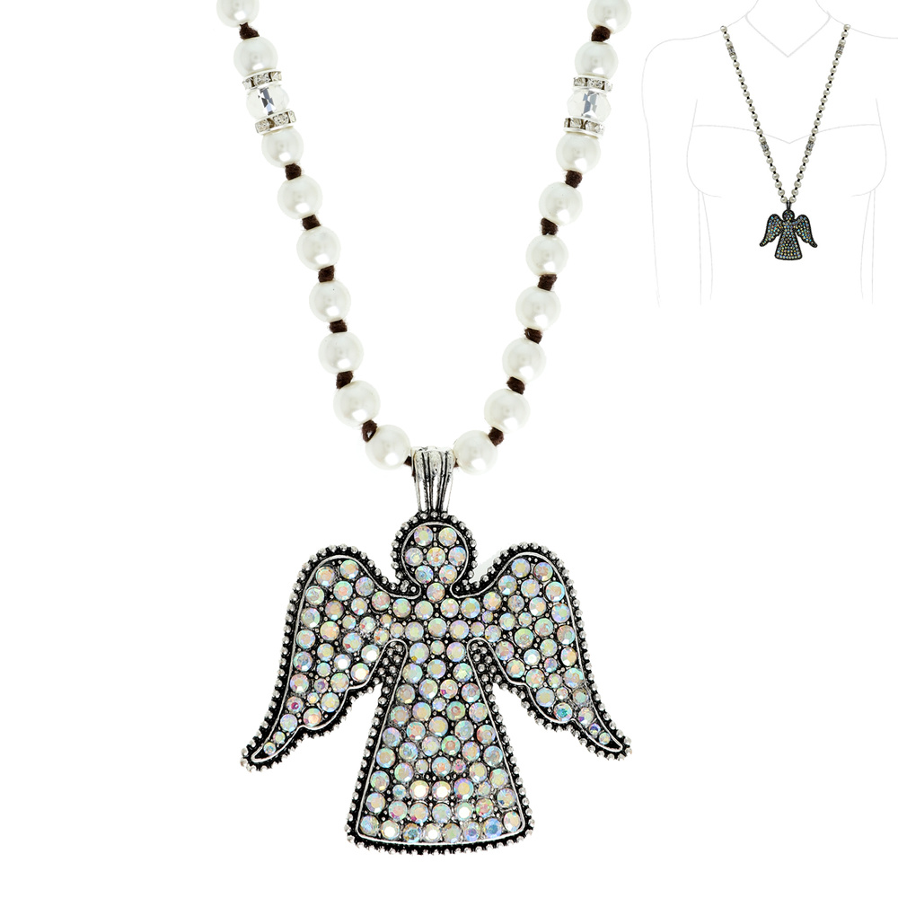 FASHION SIMULATED WHITE PEARL RHINESTONE ANGEL NECKLACE WITH EXTENSION IN SILVER-TONE