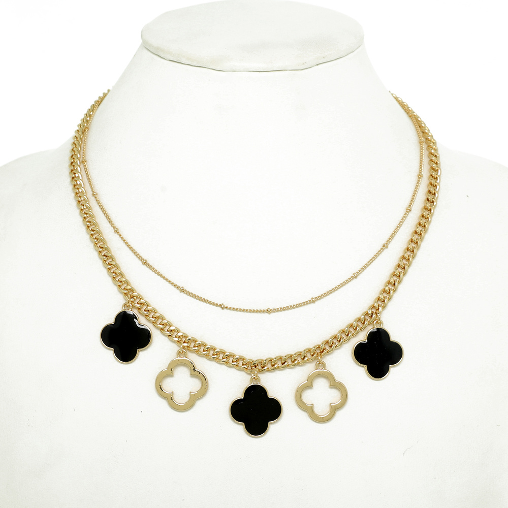 ENAMEL FOUR-LEAF CLOVER QUATREFOIL LAYERED LINK CHAIN NECKLACE