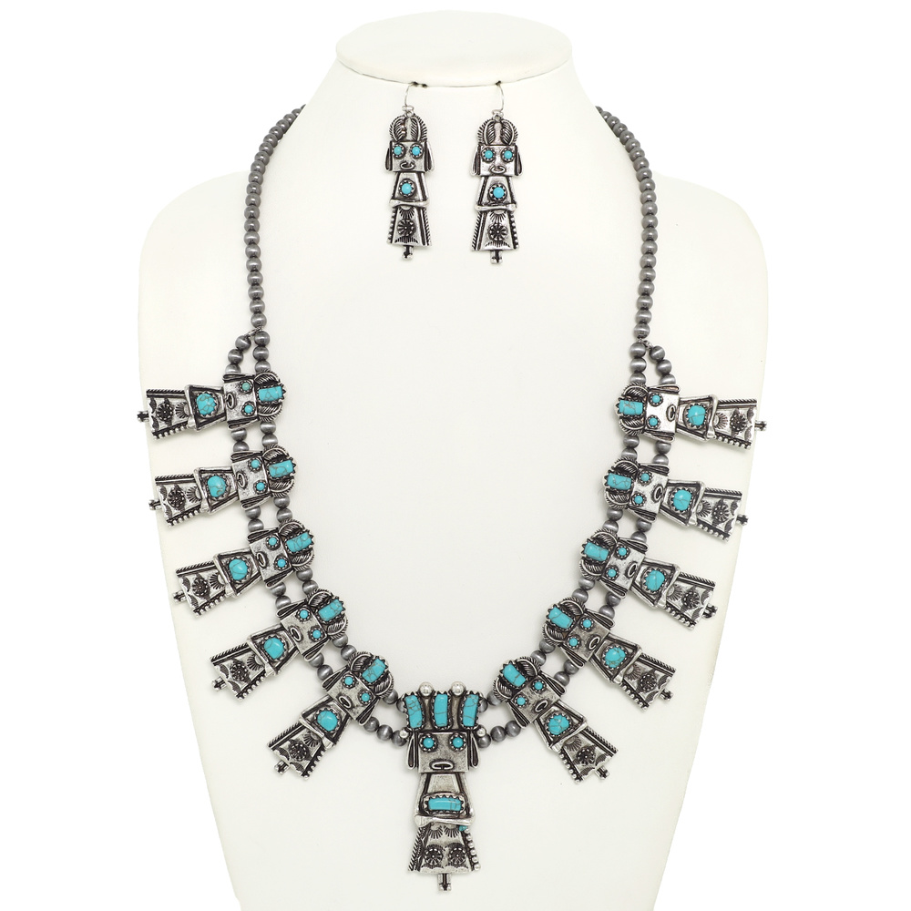 WESTERN NAITIVE AMERICAN TURQUOISE NECKLACE EARRING SET IN SILVER-TONE OXIDIZED METAL