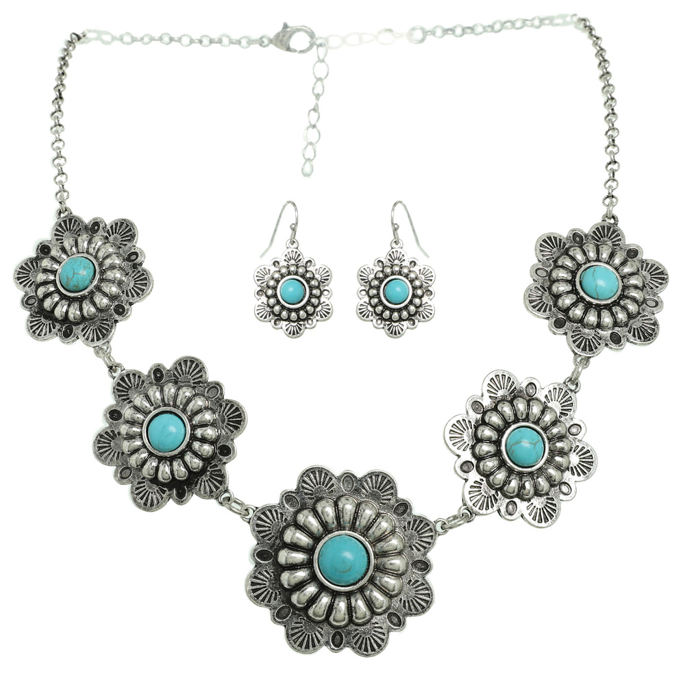 WESTERN FLOARL TURQUOISE CONCHO NECKLACE EARRING SET