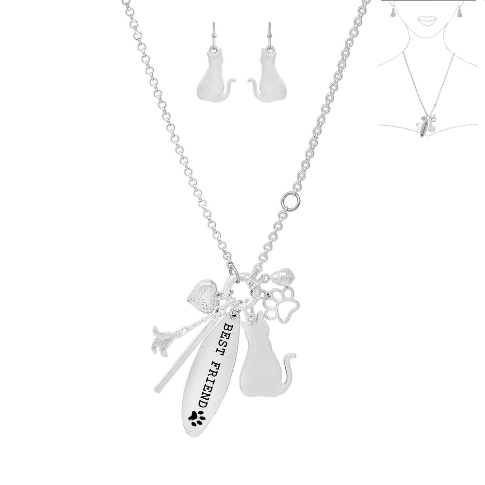 "BEST FRIEND" PET THEME MIXED CHARM PENDANT NECKLACE CAT EARRING SET