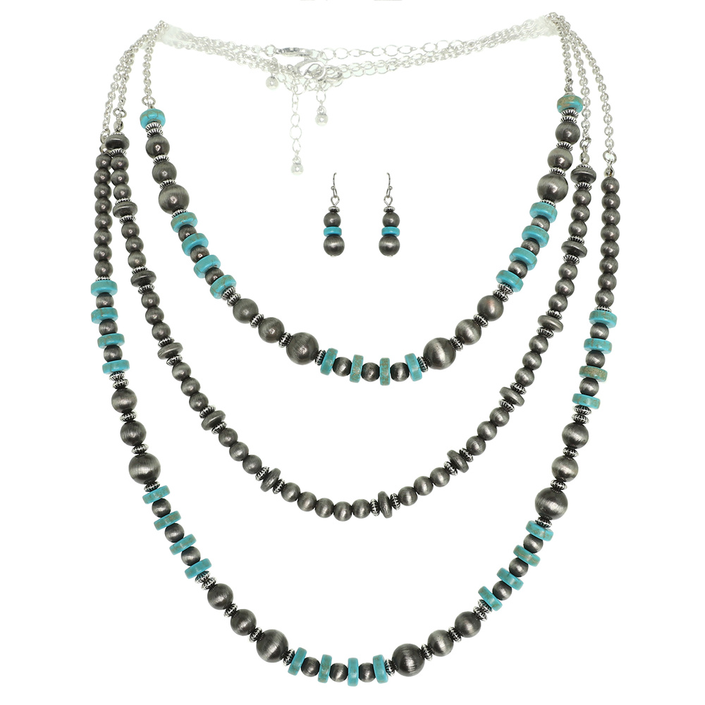 WESTERN MULTILAYERED METALLIC AND TURQUOISE BEAD NECKLACE EARRING SET