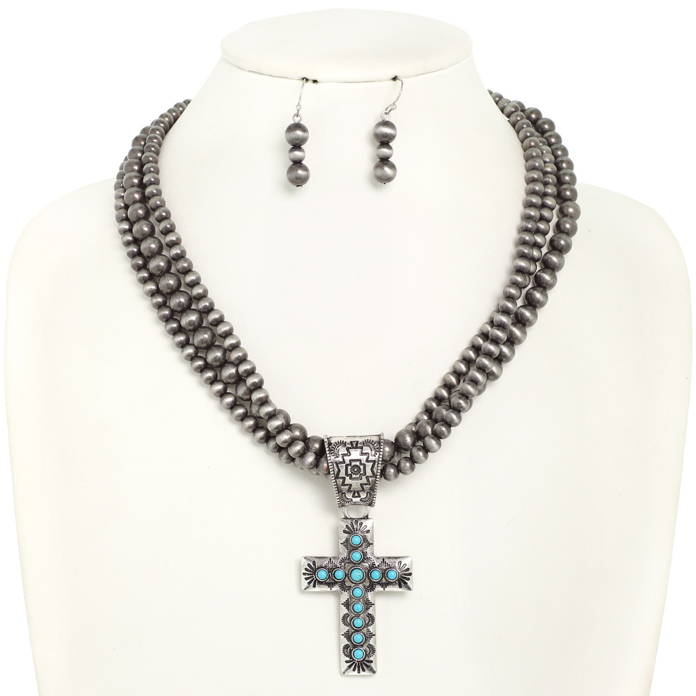 MULTI LAYERED WESTERN NAVAJO THEMED TURQUOISE CROSS PENDANT BEAD NECKLACE EARRING SET