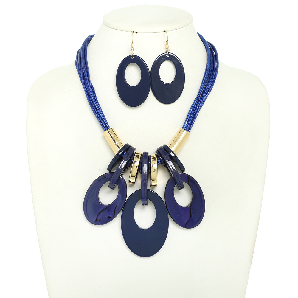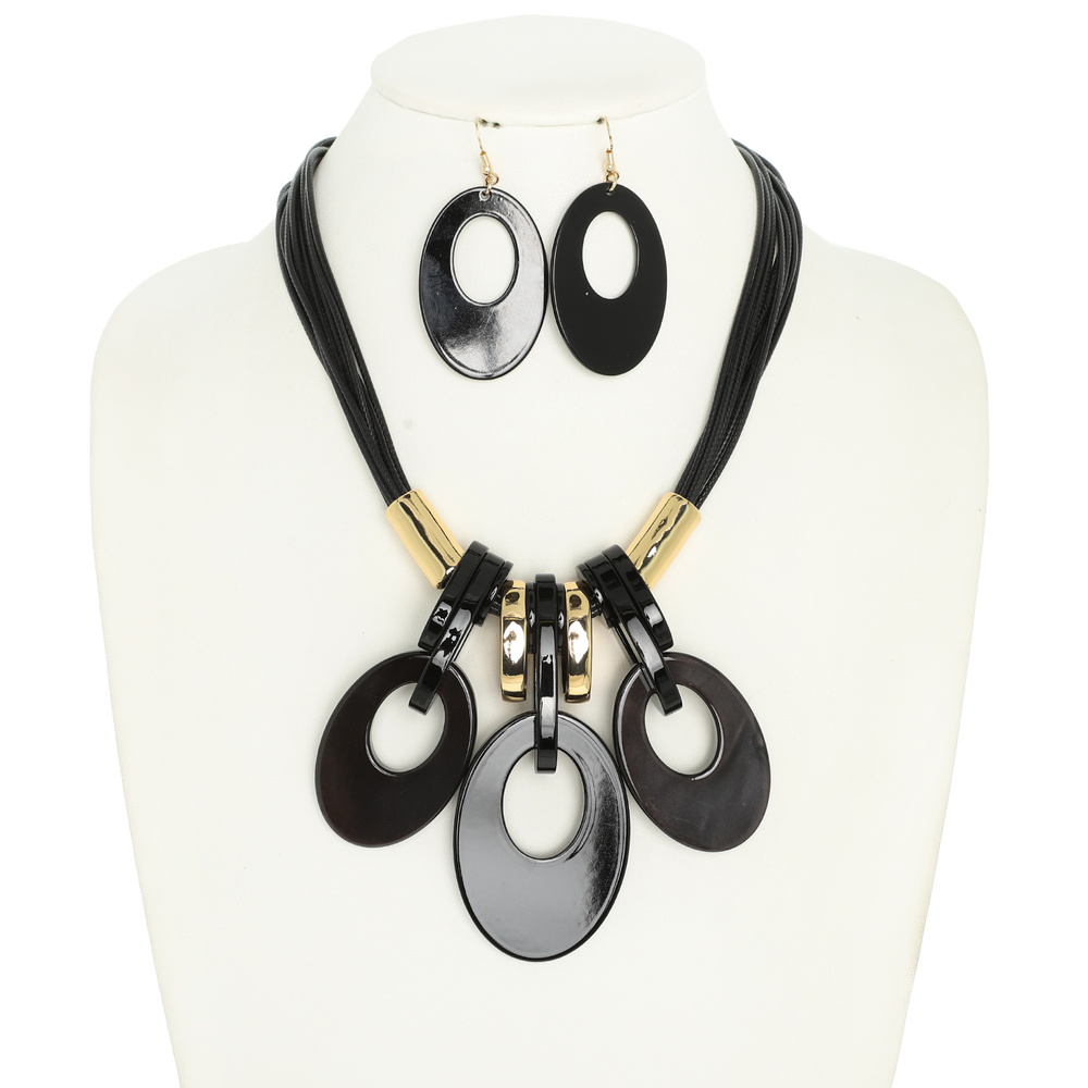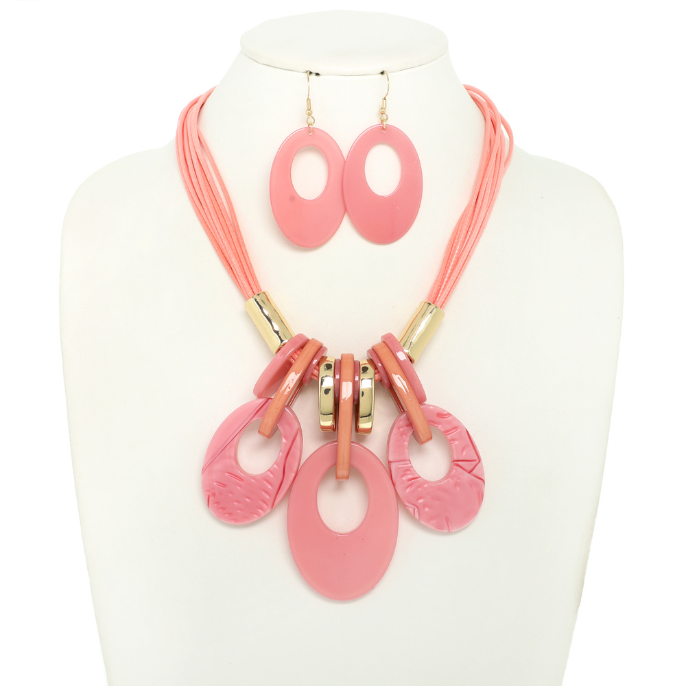 ACRYLIC OVAL DISC BRAIDED CORD NECKLACE EARRING SET