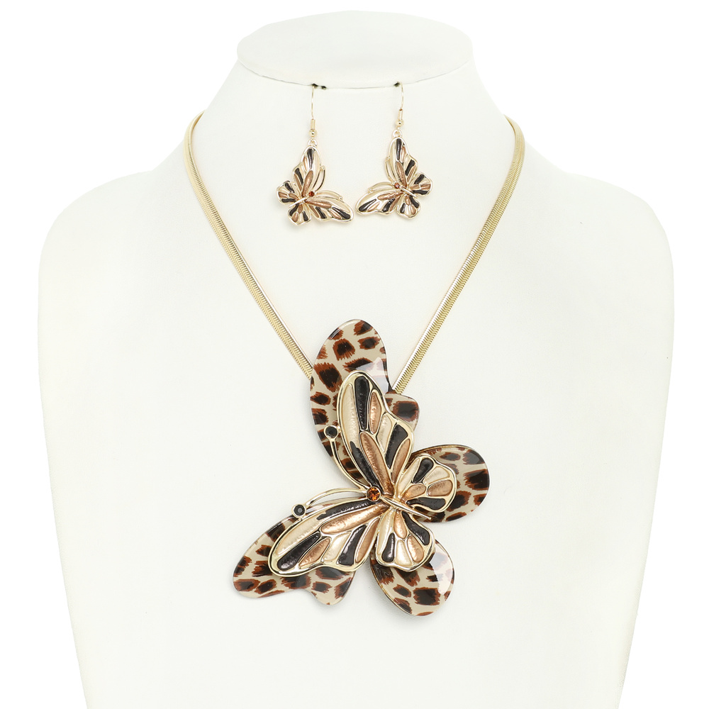 PATTERNED ACETATE RESIN CRYSTAL ACCENT BUTTERFLY NECKLACE EARRING SET