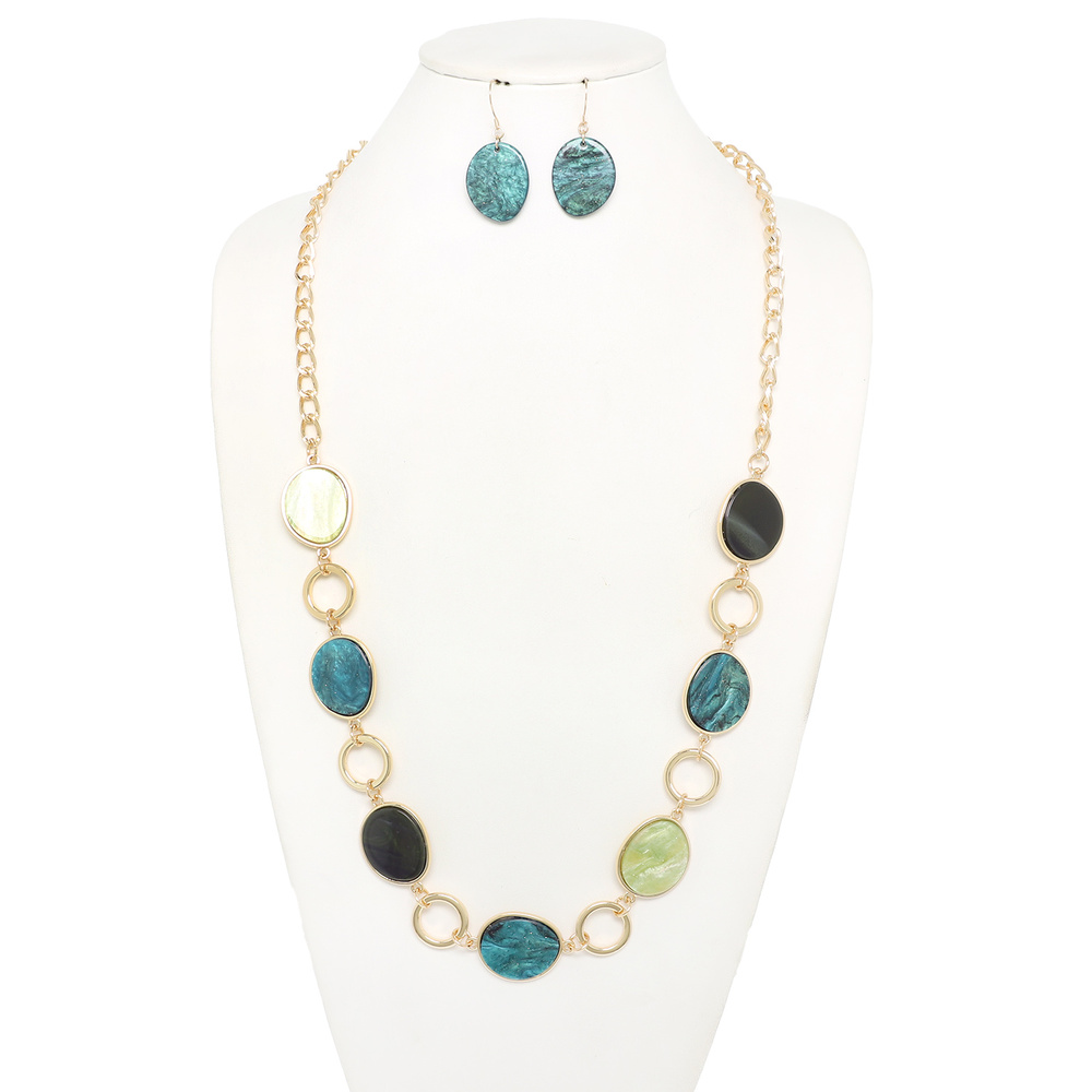 MULTIHUED GREEN EPOXY STONE STATION NECKLACE EARRING SET