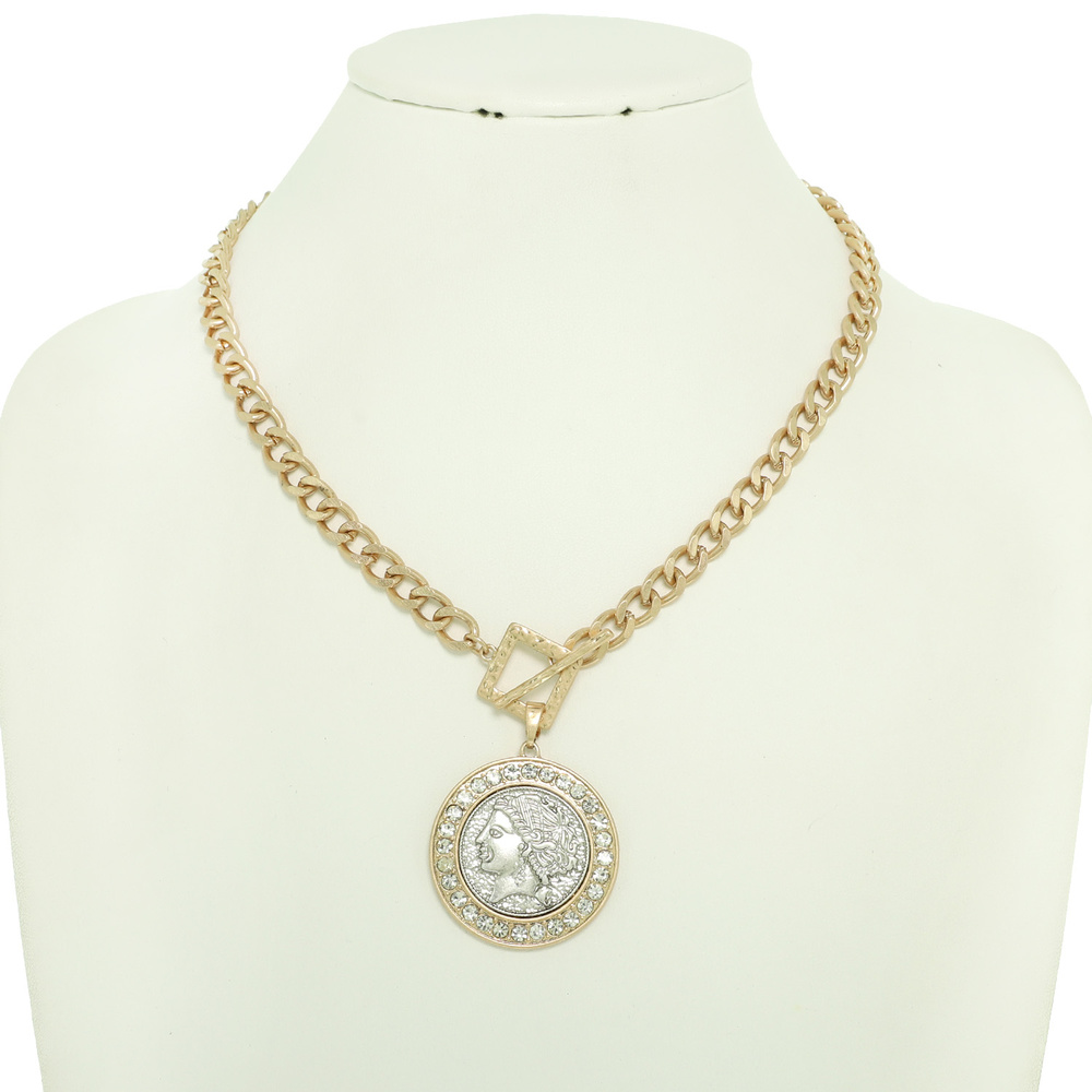 CRYSTAL EMBELLISHED GREEK ROMAN GODDESS REPLICA COIN PENDANT NECKLACE