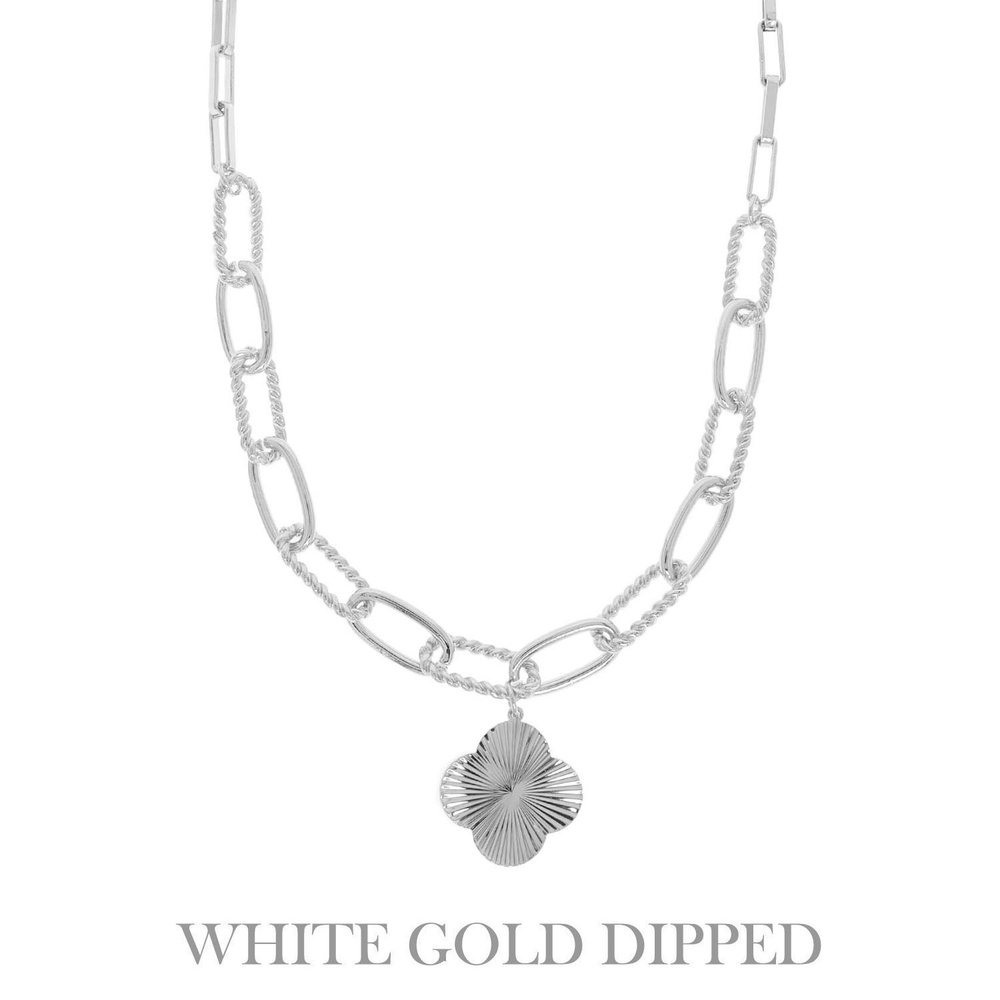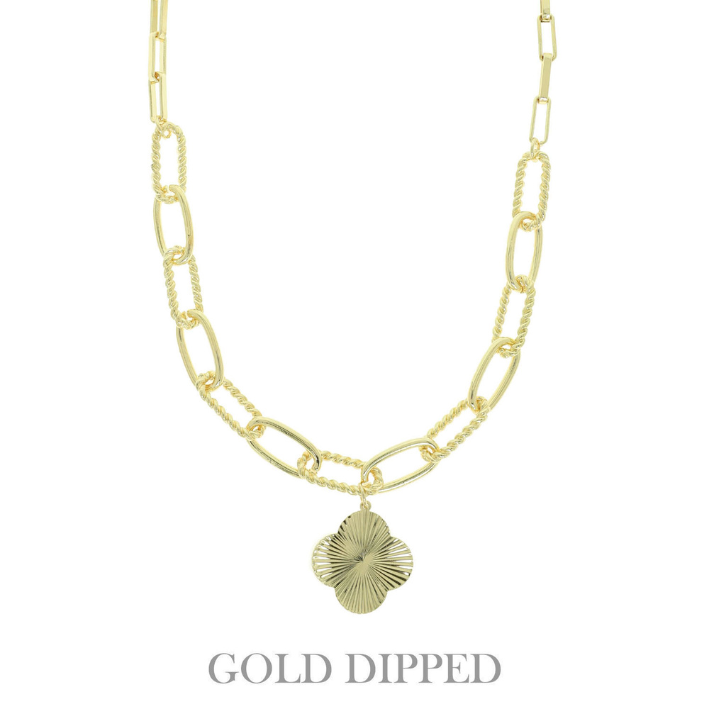 SCALLOPED TEXTURED QUATREFOIL PENDANT LINK CHAIN NECKLACE IN YELLOW GOLD PLATING