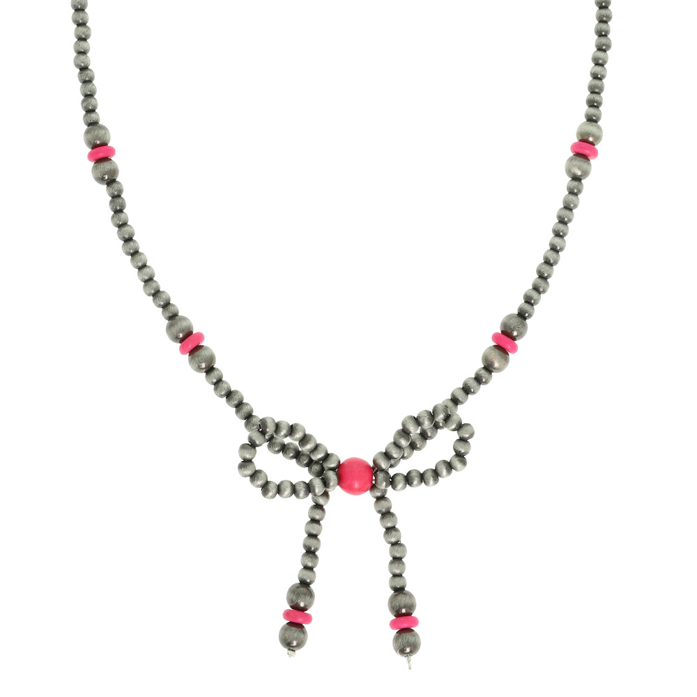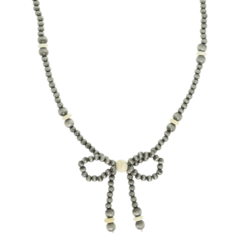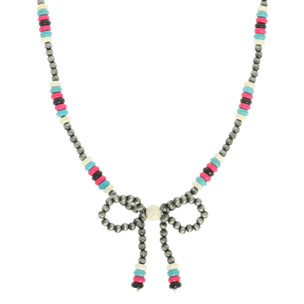 WESTERN MARBLED TURQUOISE COLORED PEARL BEAD LONG TAIL BOW PENDANT NECKLACE