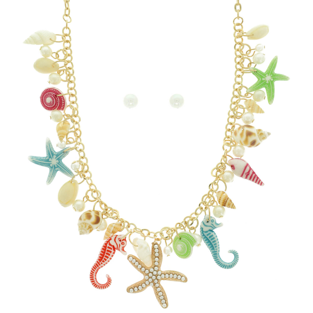 MULTI-CHARM SEA LIFE THEME PENDANT NECKLACE PEARL EARRING SET