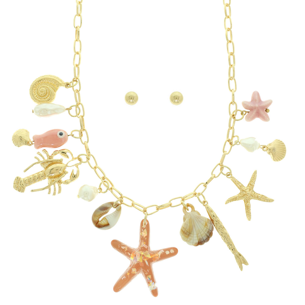MULTI-CHARM SEA LIFE THEME PENDANT NECKLACE STUD EARRING SET