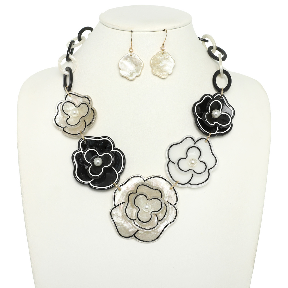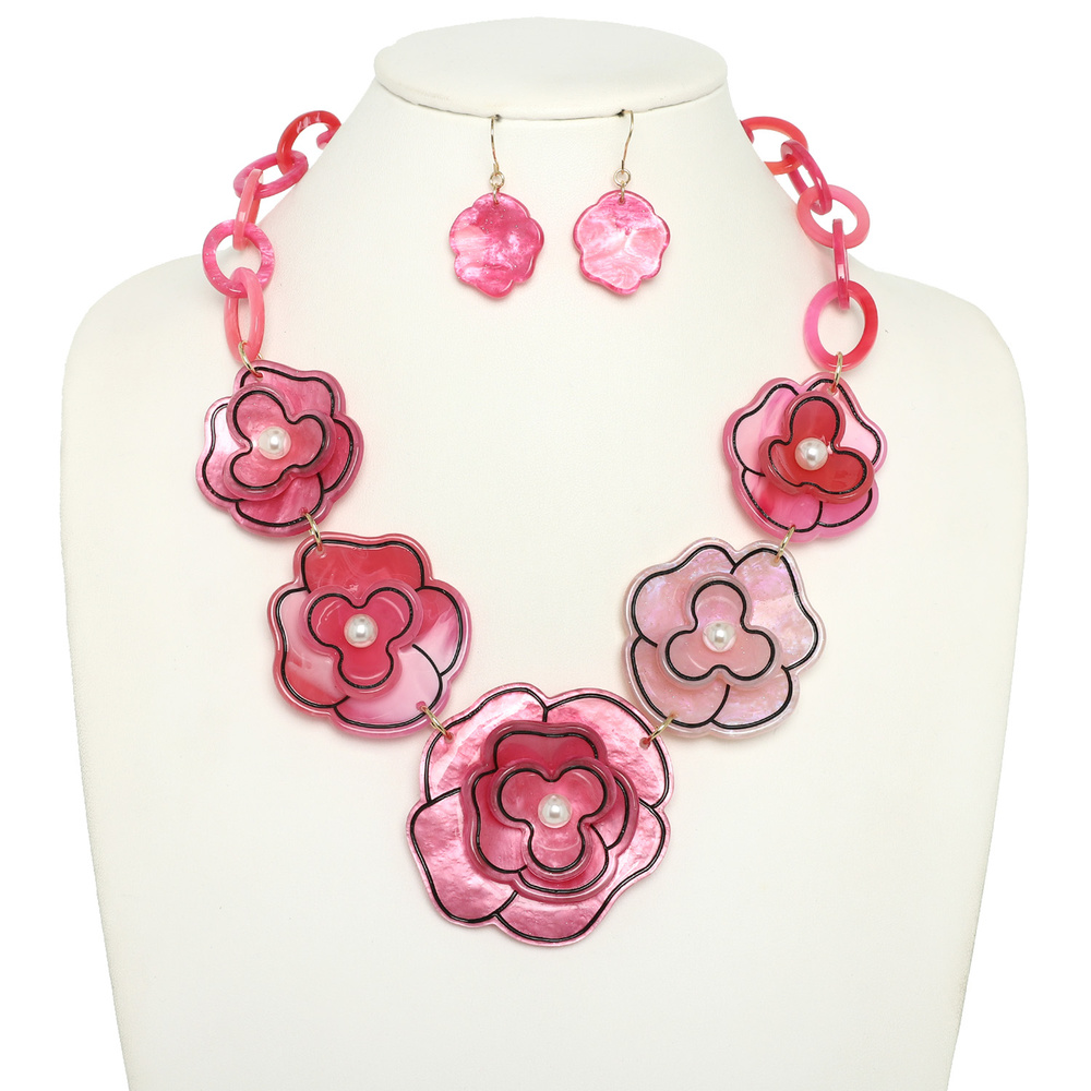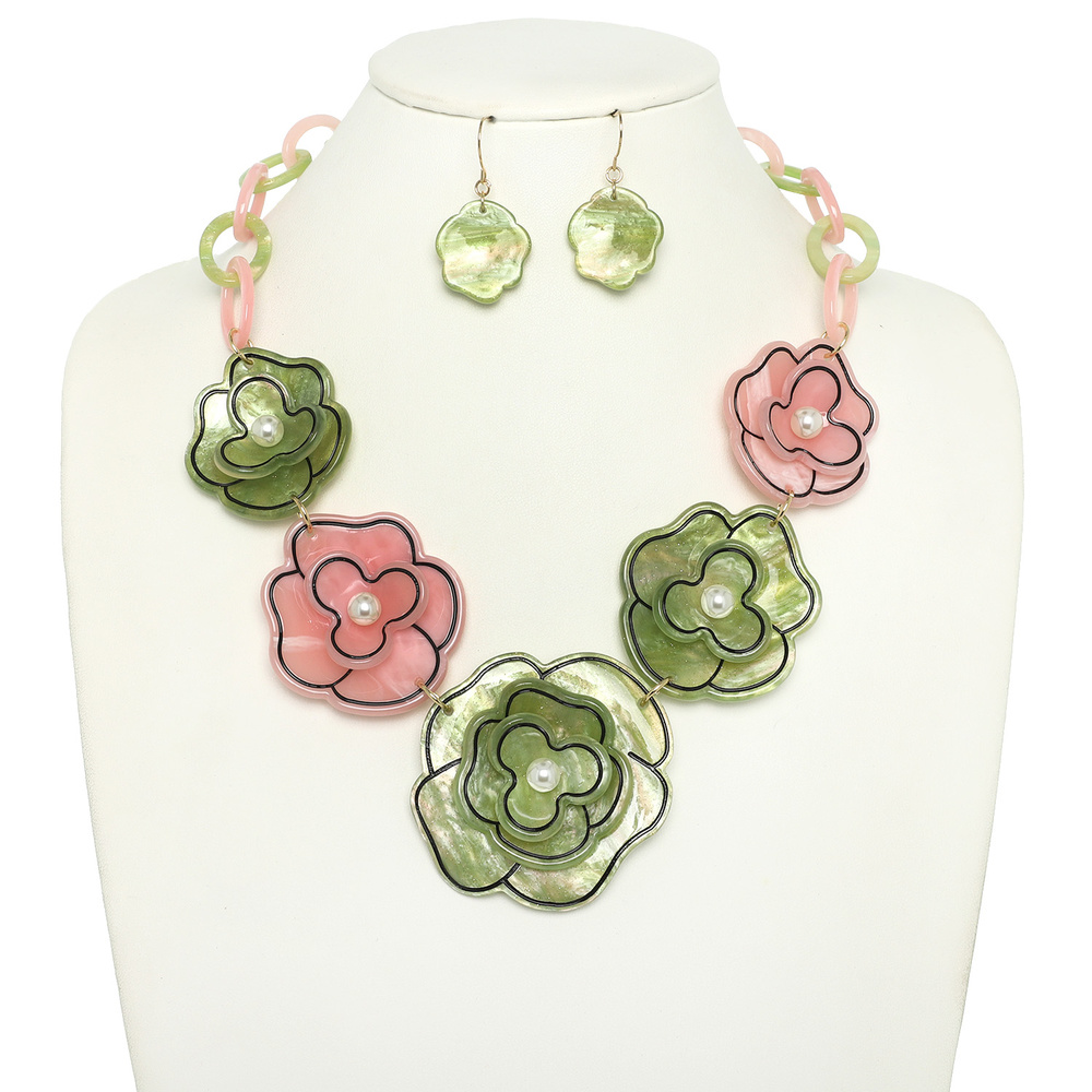 MULTIHUED PEARLESCENT AMORPHOUS LUCITE ROSE NECKLACE EARRING SET