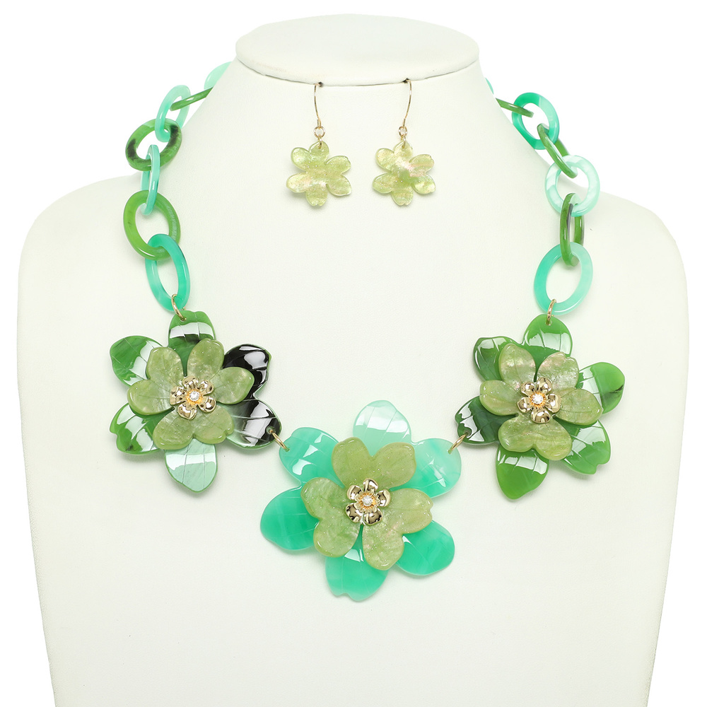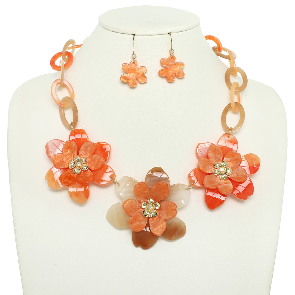 MULTIHUED PEARLESCENT AMORPHOUS LUCITE CHERRY BLOSSOM NECKLACE EARRING SET