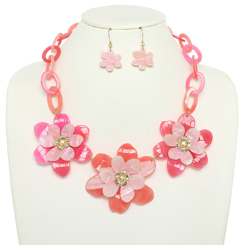 MULTIHUED PEARLESCENT AMORPHOUS LUCITE CHERRY BLOSSOM NECKLACE EARRING SET